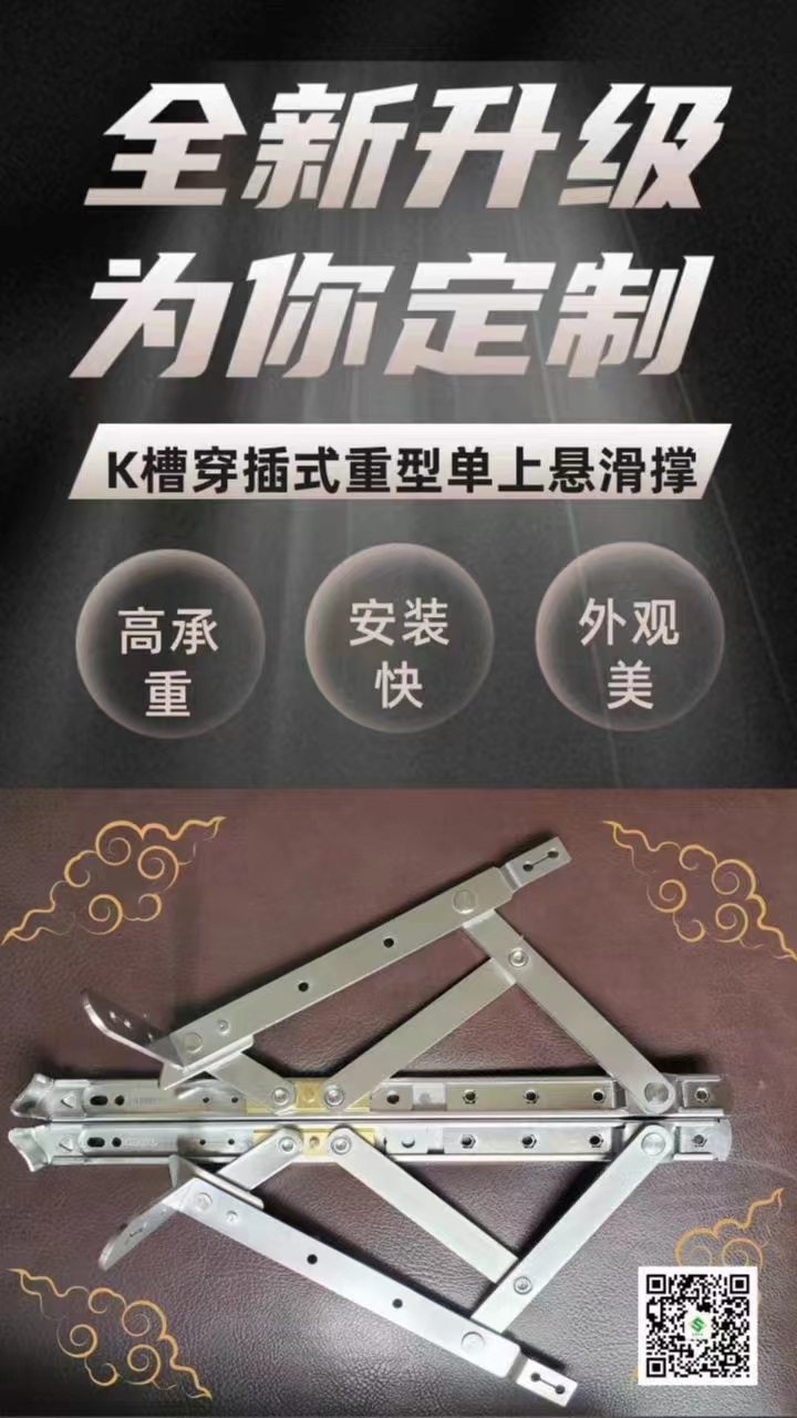 通用欧标外开型材,L型拉杆,一端穿入上扇槽口,提高承重,一端置于槽口贴底打钉,与传统上悬滑撑相比,定位和安装比较简便,角度强度也都大为提升。 304不锈钢滑撑; 承重:48-68kg; 主折片厚度4.0mm其余3.0mm; 滑槽厚度1.2mm,分左右。