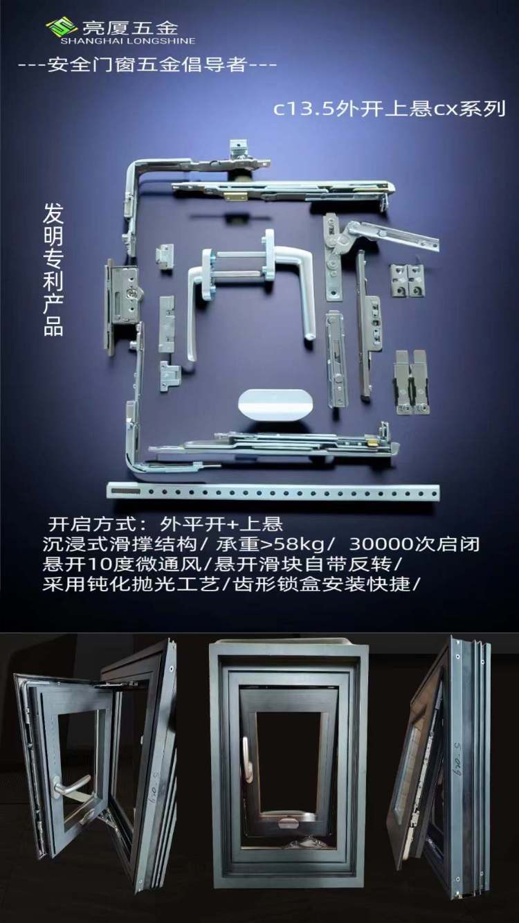 首创外开下悬五金系统,既可以平开,也可以上悬,填补国产两开窗型空白。相比内开内倒五金,更加符合国内的开窗习惯,具有良好的通风、安全、实用、防盗、密封保温、开启方式不占用室内空间等优点。亮厦五金始终致力于外开上悬系统五金的完善与升级,目前已经拥有相关40多项专利。 适用于通用欧标型材,304不锈钢滑撑,通过承载38kg,35000次两开检测,分左右,窗型试用范围:宽度400-1200mm,最大高度1800mm。