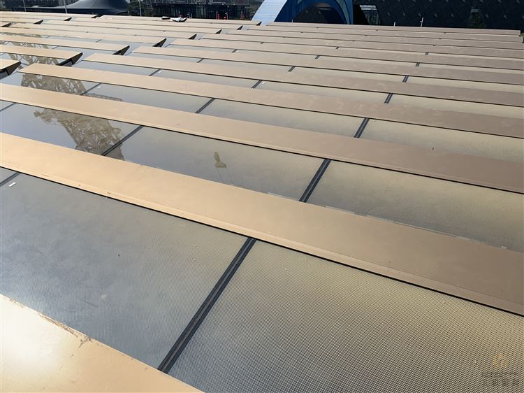 1、屋面阶梯式单元幕墙(9米X1.5米);2、天窗采用创新的内置排水构造;3、钢立柱与玻璃肋新型组合式龙骨;4、超大玻璃百叶造型;