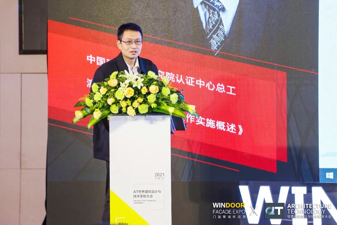 中国建筑科学研究院认证中心绿色产品部主任何更新先生发表报告,题为《绿色建材评价认证工作政策导向》。何主任在报告中介绍了推进绿色建材产品认证工作的意义,并给出了如何推进绿色建材产品认证工作,以及门窗相关行业如何开展绿色建材产品认证工作的建议。