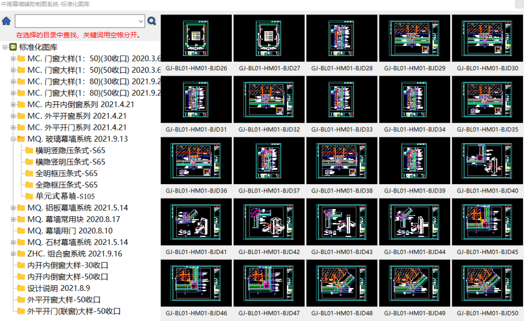 浙江中南建设集团有限公司专为幕墙施工图设计而开发了标准化图库管理系统。该系统整合了公司已发布的玻璃幕墙、铝板幕墙、石材幕墙、玻璃栏板等系统化模块,在细部构造方面对幕墙性能、材料的使用、施工的可行性方面均做了优化提升。并且契合幕墙设计流程和幕墙设计师使用习惯,使图纸的标准化程度、各环节管理效率显著提升。