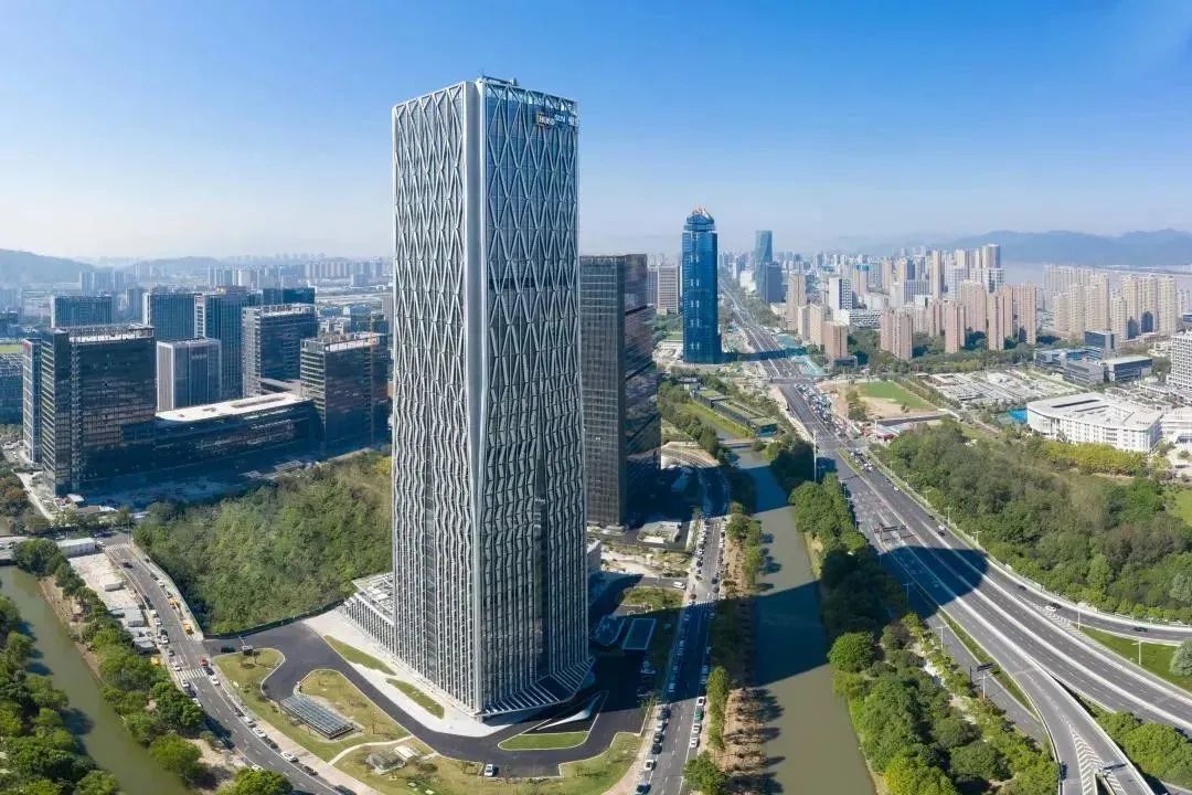 “神龙文化”是华夏文明的重要组成,有关于“龙”的传说比比皆是;恒生数智中心与钱塘江咫尺相望,汲取“钱王射潮”“钱江龙”标志性雕塑设计内涵,以“龙鳞”作为幕墙铝板造型呈现,映射钱塘江水奔腾涌动与粼粼惬意的双重形态。