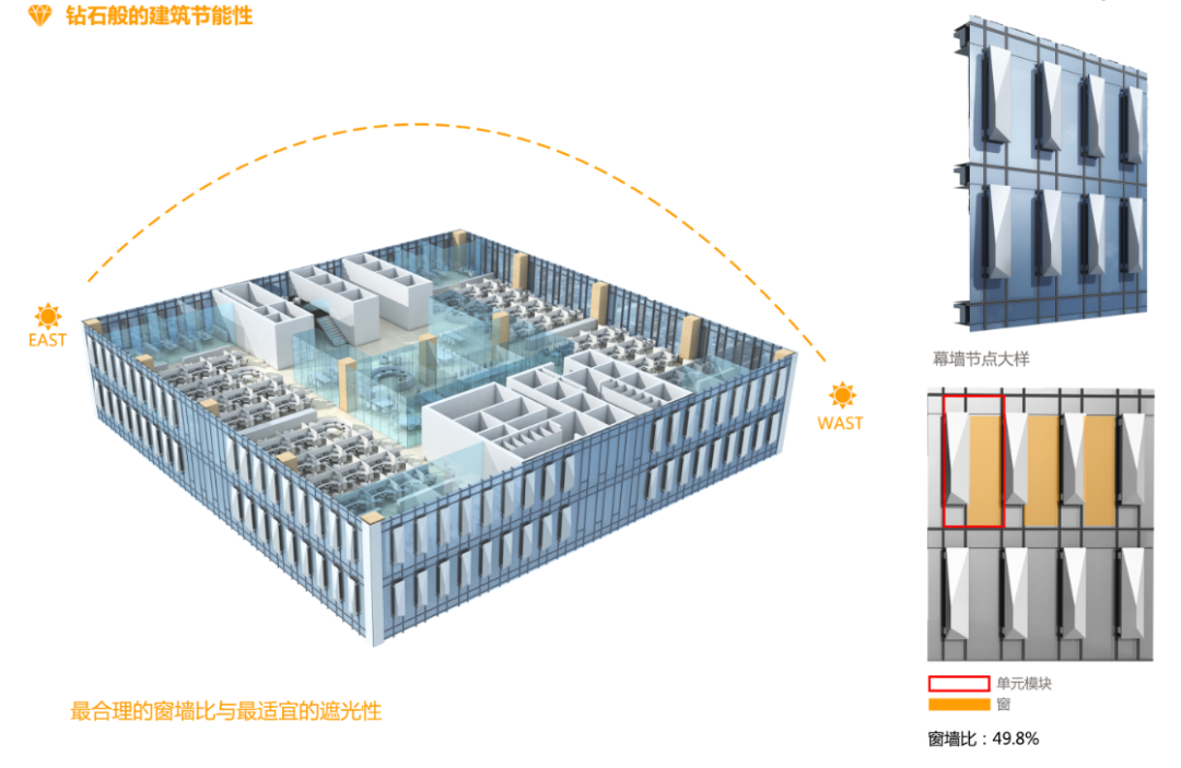 玻璃幕墙设置满足单个立面透明玻璃占墙面比≤0.6。铝板幕墙内侧采用50mm厚保温岩棉,铝合金型材采用断桥隔热型材。铝板幕墙和铝合金装饰板等金属材料均采用亚光表面处理方式,降低反射率。以上这些措施有效增加了幕墙的节能性能和低碳环保性能。