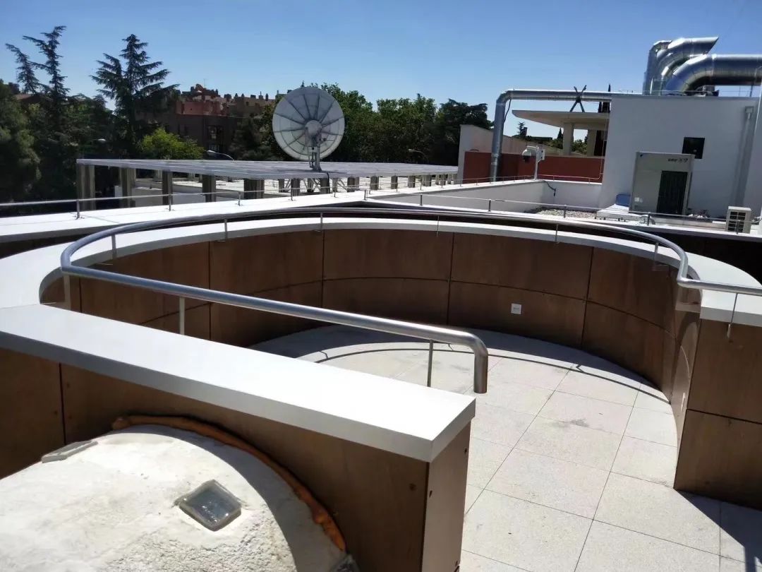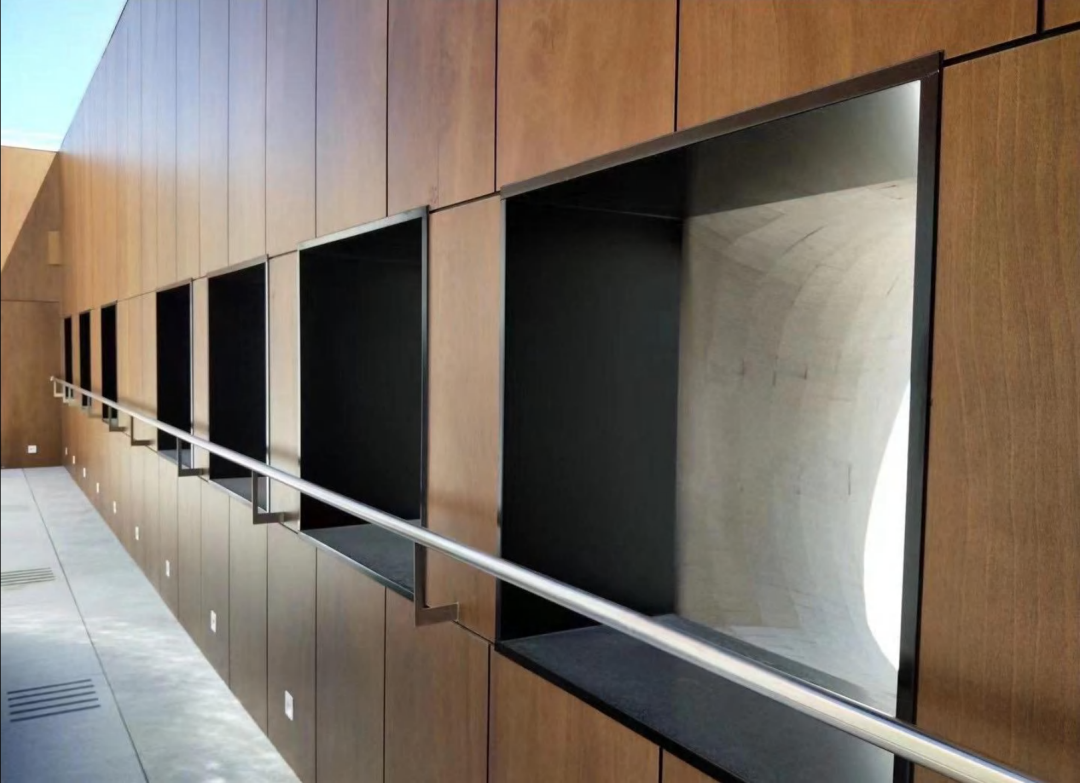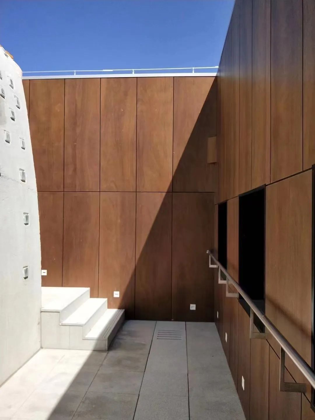 COMPACTWOOD克姆伍德木纤维板在中国驻西班牙大使馆项目外墙楼梯墙面部位及户外露台墙面部位采用平板效果及曲面效果搭配应用,曲面部位采用6毫米外墙木纤维板应用拉铆钉固定安装实现大曲率弯弧效果。