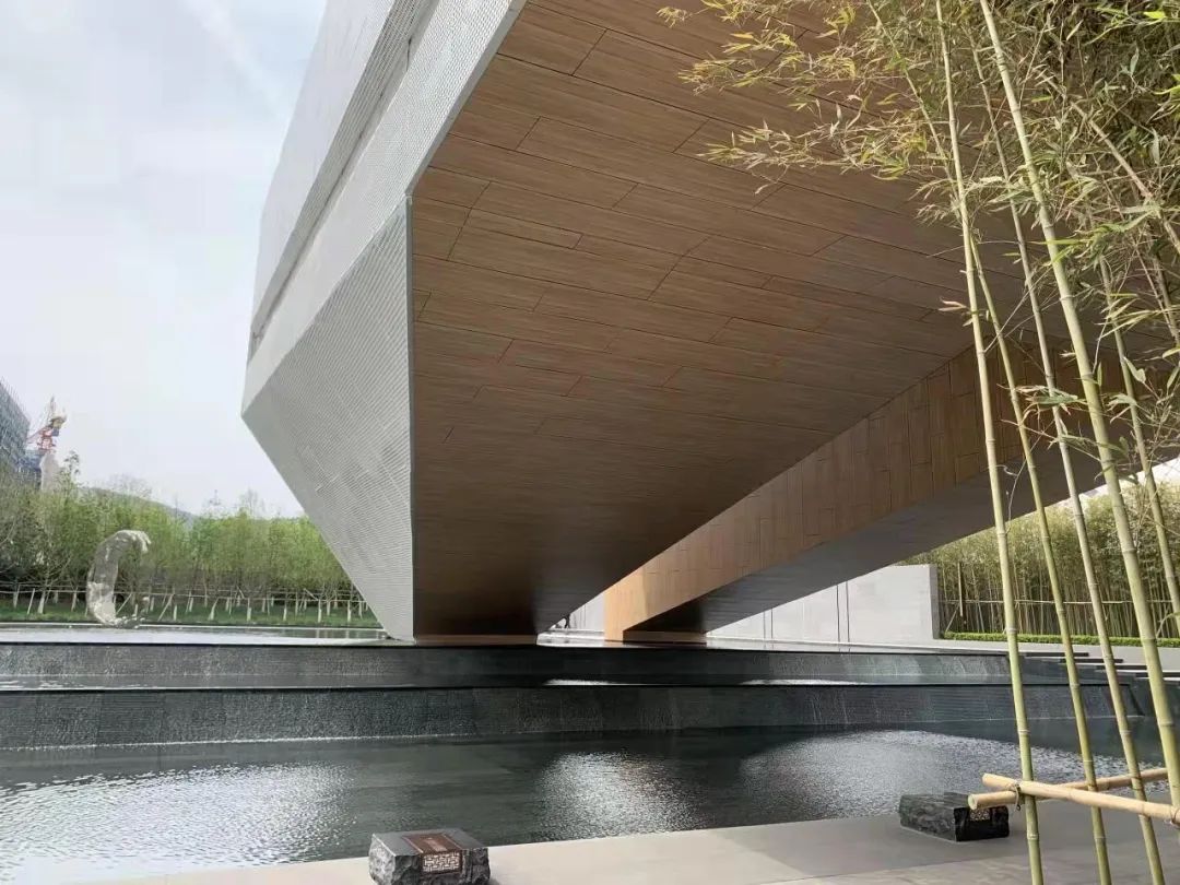 为实现建筑效果一体化,木纤维板采用仿石纹系列效果,板材应用于建筑的户外吊顶部位。木纤维板总重量约为同尺寸传统石材重量的六分之一,约每平方10kg左右,相对传统石材更具安全环保性。