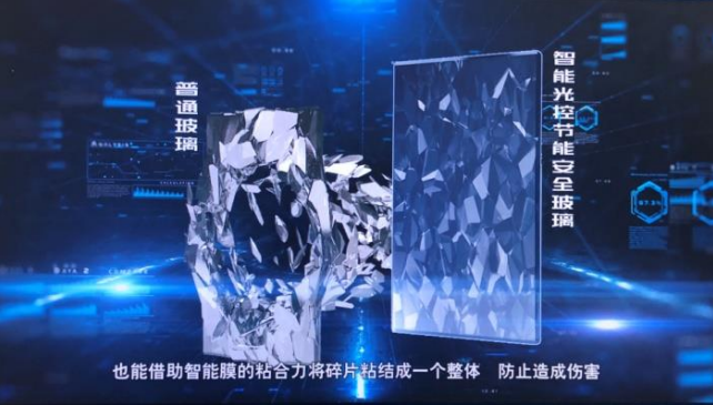 智能光控节能安全隔热玻璃韧性比普通玻璃高出15.7倍。钢化玻璃能承受的压力小于91Pa,贴膜钢化玻璃最小承压为 1436Pa,最大承压为3112Pa 。抗撞击能力、隔音效果和防盗性能优越;可避免台风或其他外力撞碎,即使意外被撞碎,也能借助智能膜的粘合力将碎片粘结成一个整体,防止造成伤害。采用贴膜措施正好解决了在(住房城乡建设部国家安全监管总局关于进一步加强玻璃幕墙安全防护工作的通知)38号政府令中提到:减少玻璃自爆产生的安全问题。