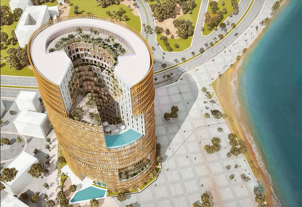 该项目是一家位于沙特阿拉伯吉赞的五星级酒店。该建筑的灵感来自吉扎尼亚人的传统住房,影响了网眼,代表用作支撑材料的稻草,其想法是将传统的真实性转移到海滨地标。