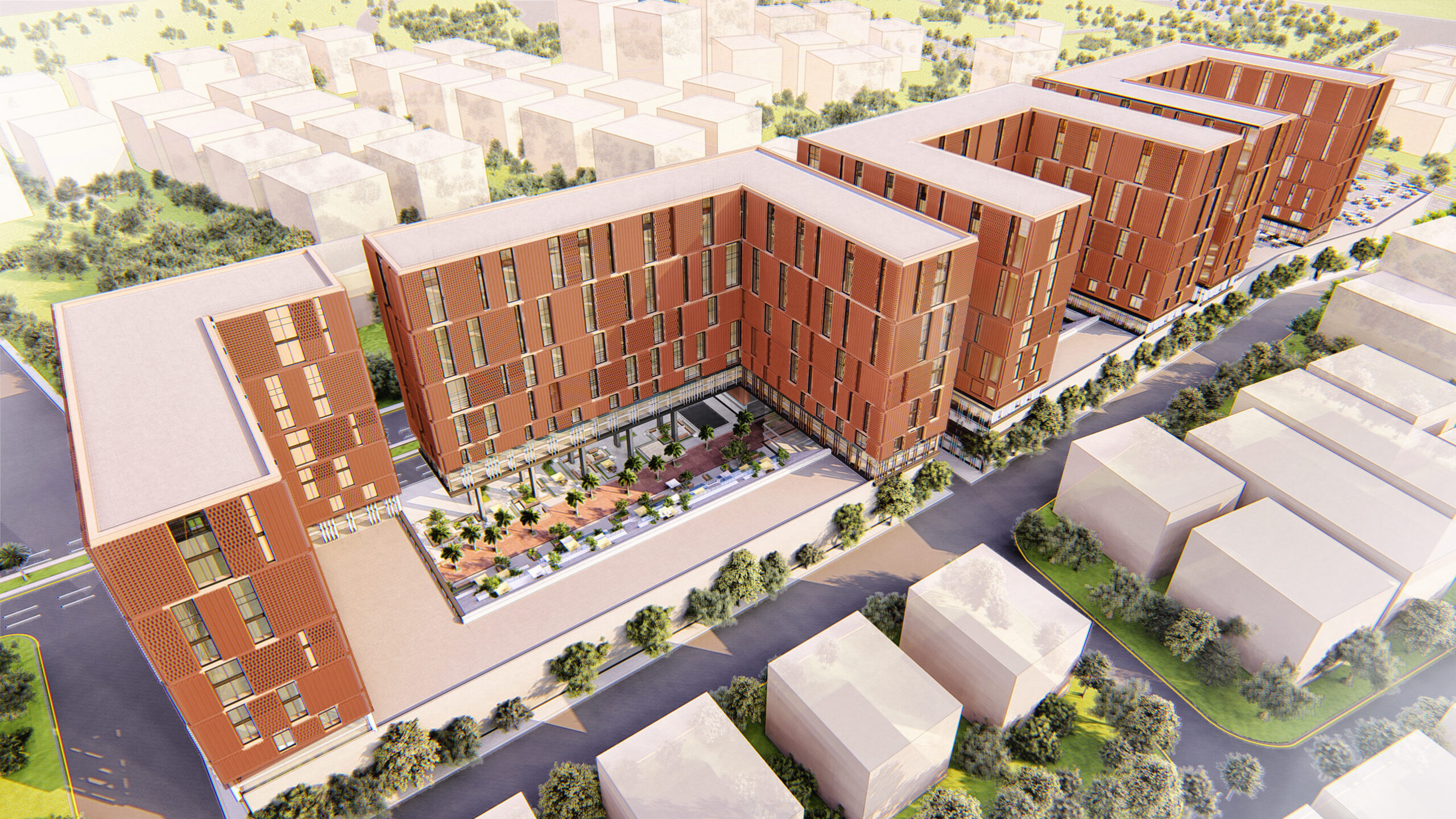 各种元素的和谐融合。该设计由四座塔楼组成,包括酒店、办公楼和服务式公寓,以及三层作为裙楼的商业楼层和两层用于停车场的地下室,反映了细致的规划和深思熟虑的建筑。该项目的与众不同之处在于在综合体内整合了三个法院,作为长廊和娱乐活动的公共空间。