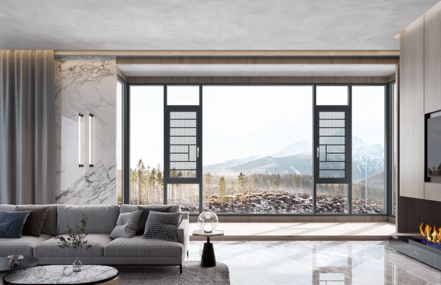 窗扇一体设计,通风防蚊虫;开启部位带有防护栏,具有较高的安全性能,能防止室内人员意外坠落,有效阻挡室外人员非法闯入; 水密、气密、抗风压等性能均达到国标至高等级; 内开纱扇圆弧护角设计,有效降低磕碰风险。