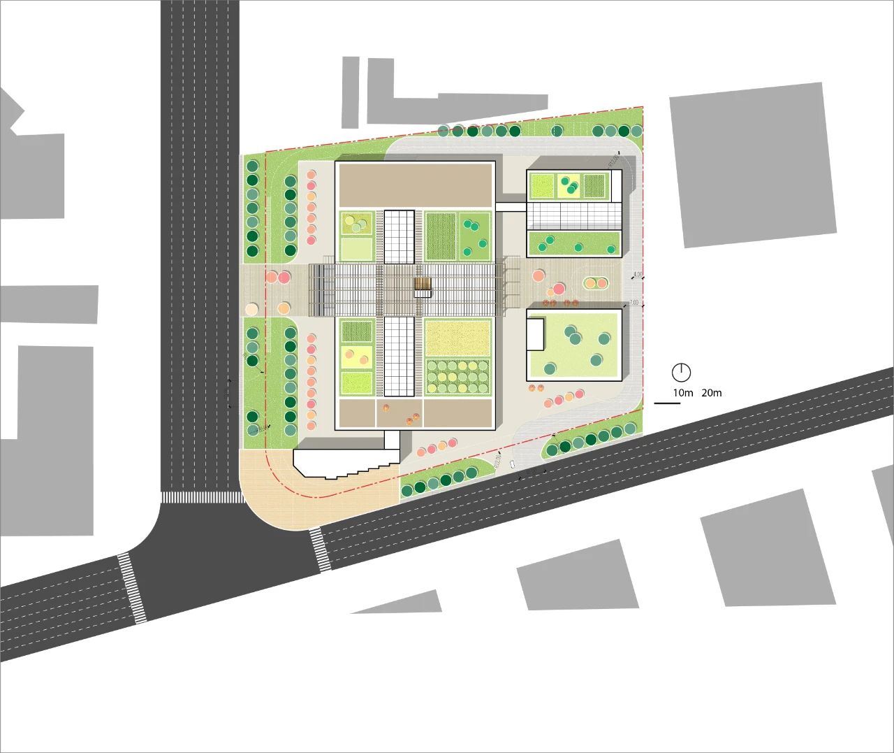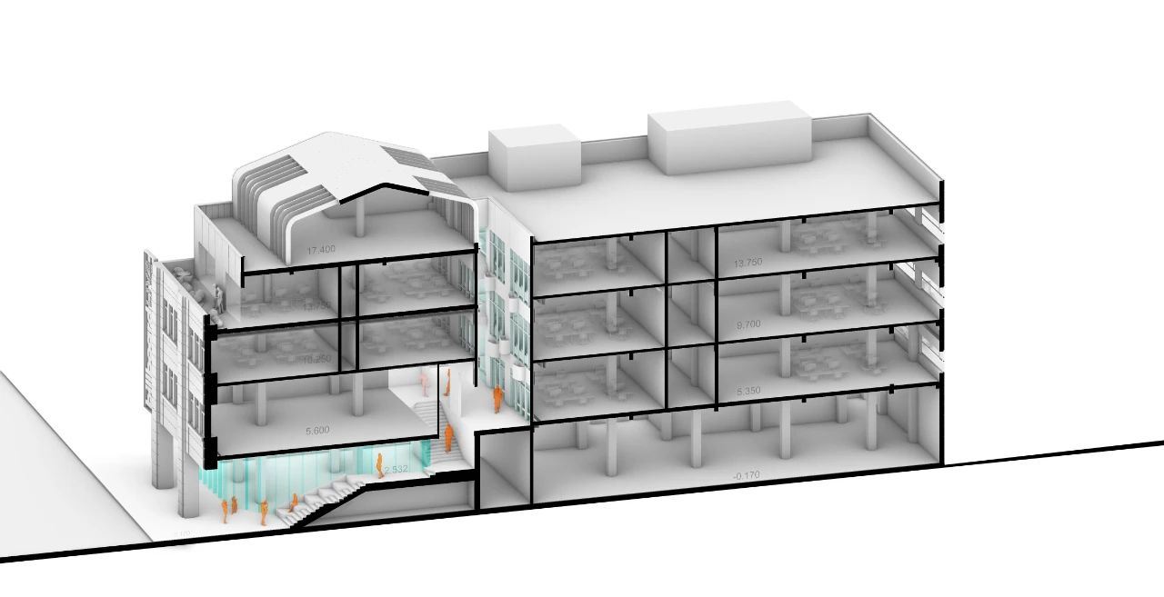 在底层加入了大台阶设计,打开了两座建筑中已经粘合的区域,恢复了它旧有的状况。去掉了屋顶,并在两座建筑之间创建了一个开阔的中庭,大台阶成为了新建筑和后侧建筑的入口,行人不必再穿过肮脏的小巷,两座建筑间的中庭就像整个社区的客厅一样。