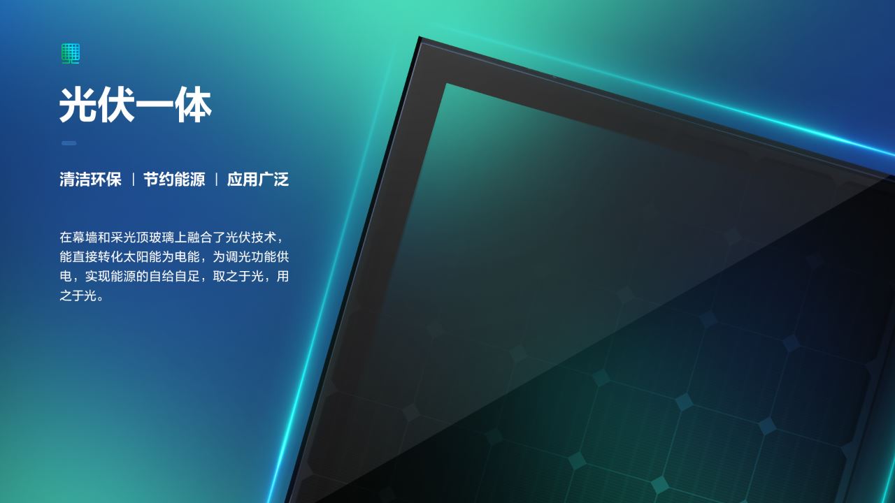 取之于光,用之于光,是真正的零碳产品。它可应用在玻璃幕墙、遮阳天幕和会议室等有遮阳或隐私保护的场景,未来应用前景广阔。