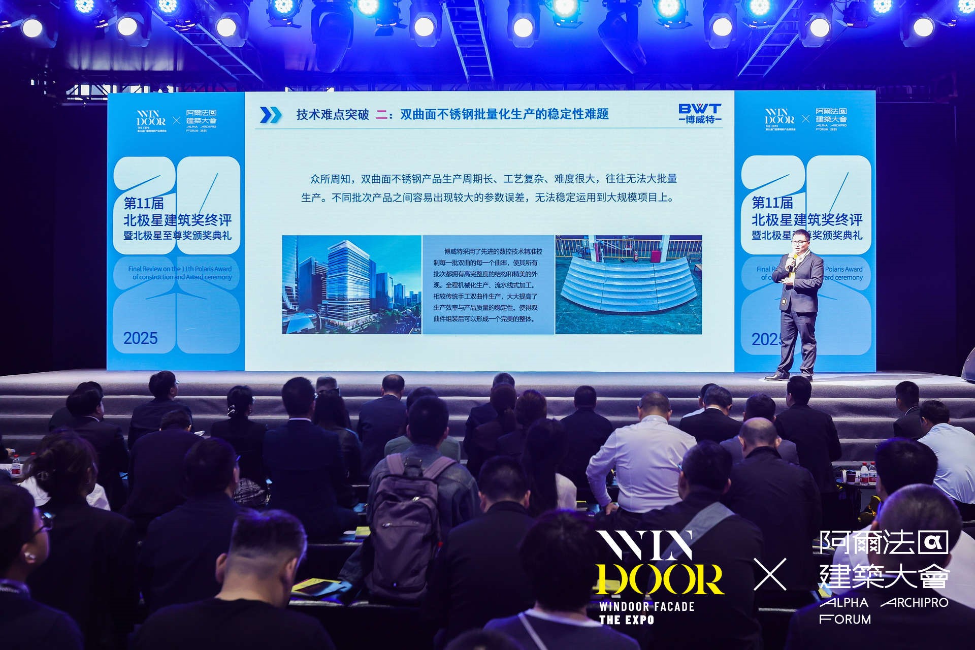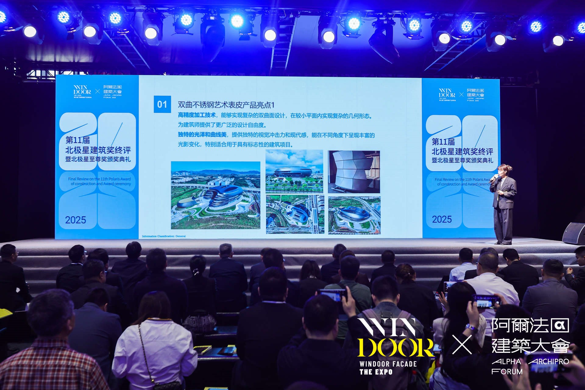 2025年3月11-13日,不锈钢钢板厂家无锡博威特金属科技有限公司的【不锈钢钢板雾面砂双曲遮阳板】及上海东阁不锈钢实业集团有限公司【双曲不锈钢钢板艺术表皮】获得了第11届北极星奖,亮相阿尔法建筑论坛(大会)及WINDOOR第31届门窗幕墙新产品博览会现场,该不锈钢钢板获奖产品在展会现场北极星奖展区进行了为期3天的展览展示,吸引了数以万计的观众前往参观。