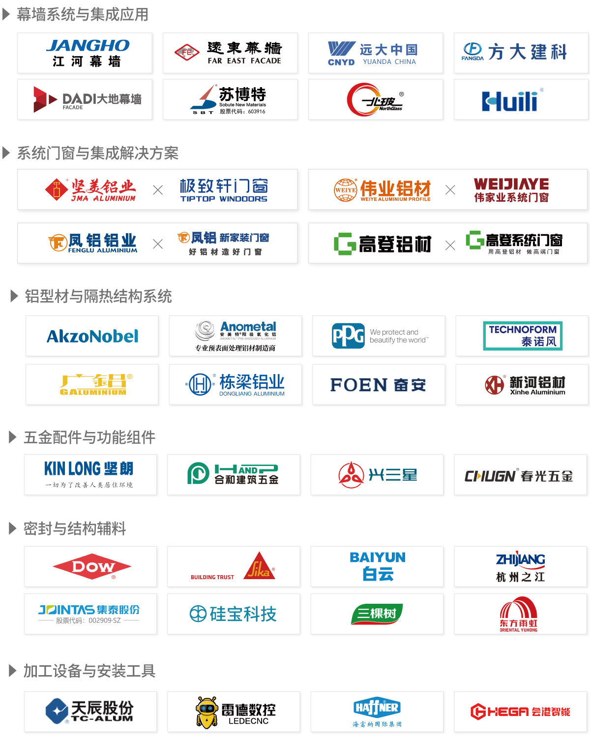 广东坚美铝型材厂(集团)有限公司、佛山市三水凤铝铝业有限公司、广东广铝铝型材有限公司、广东伟业铝厂集团有限公司、广东高登铝业集团、栋梁铝业有限公司、广东季华铝业有限公司、广东广源铝业有限公司、广东新合铝业有限公司、广东高明永利坚铝业有限公司、广东新银百铝业有限公司、广东坚朗五金制品股份有限公司、兴三星云科技股份有限公司、春光五金有限公司、倍络得上海国际贸易有限公司、杭州之江有机硅化工有限公司、广州白云科技股份有限公司、成都硅宝新材料有限公司、广州集泰化工股份有限公司、陶氏(上海)投资有限公司、西卡(中国)有限公司、泰诺风保泰(苏州)隔热材料有限公司、阿克苏诺贝尔(中国)投资有限公司、江苏苏博特新材料股份有限公司、上海安美特铝业有限公司、东南九牧(河北)铝业有限公司、上海汇丽-塔格板材有限公司、佛山市南海嘉多彩粉末涂料有限公司、济南天辰智能装备股份有限公司、山东明美数控机械有限公司、宁波信高节能材料有限公司、奋安铝业股份有限公司、佛山市镭科智能设备有限公司、山东雷德数控机械股份有限公司、广州会港智能装备有限公司等。