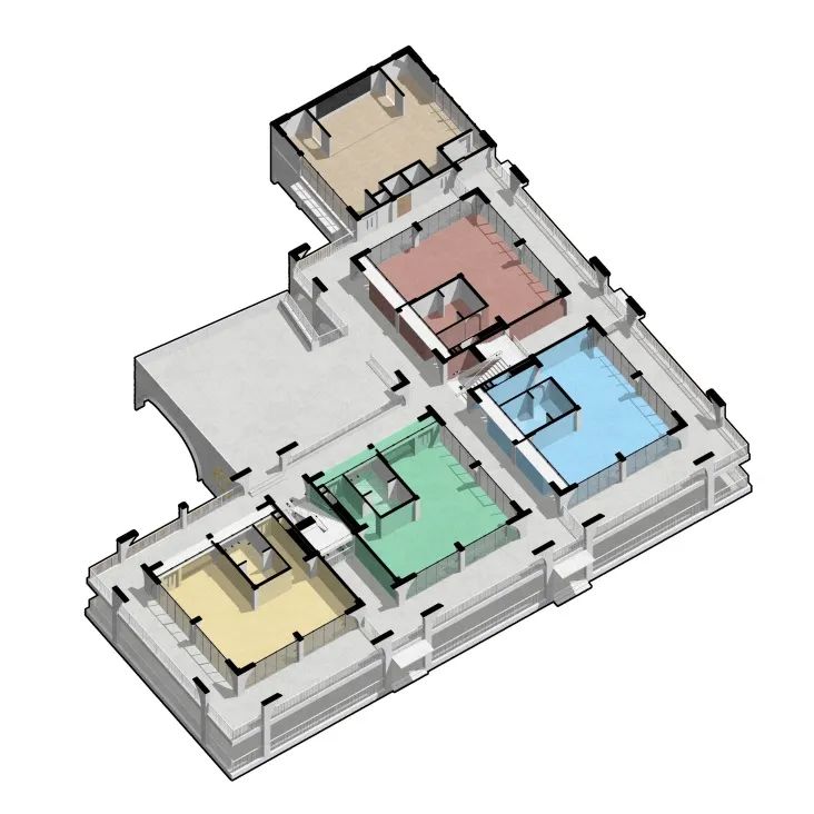 建筑以“空、轻、透”的姿态介入老城:单元格构的尺度呼应旧街区肌理,形体自下而上的退缩消解了大体量压迫感。当孩子们在层层走廊间嬉戏,他们的身影透过景框成为老城的动态风景,而斑驳的旧城墙面亦被转化为建筑的“天然背景画”。这种双向的视觉渗透,让新建筑与老城区形成温柔的对话。