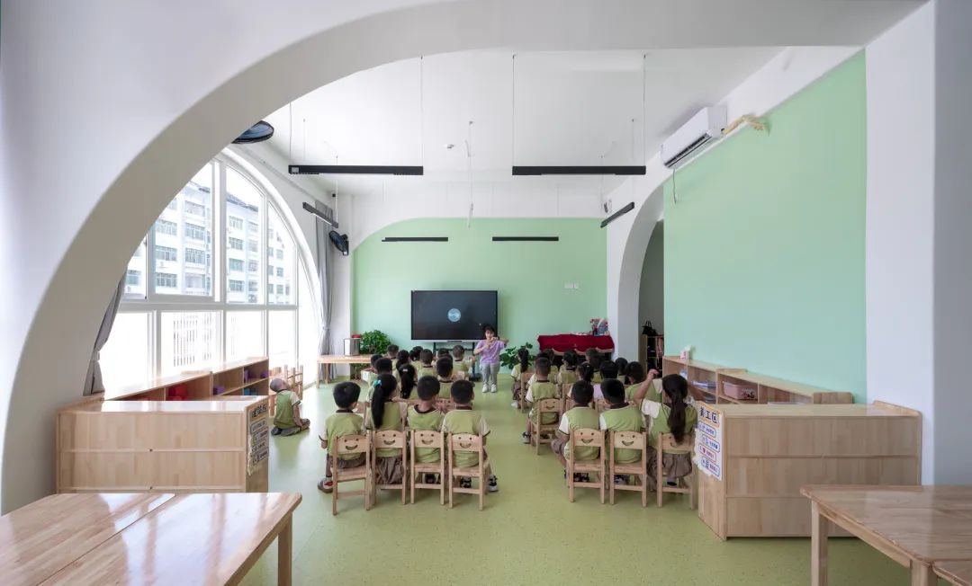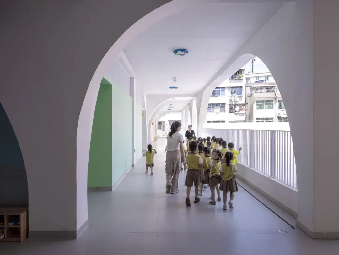 多功能门厅兼作文艺汇演场地,环形走廊承载小游戏,甚至建筑前的小广场也成为居民驻足的“街头剧场”。园长的评价“可用空间比想象中更多”,揭示了空间复合利用的魔力 —— 当用地不足成为设计契机,弹性场景的创造反而催生了更高的使用效率。
