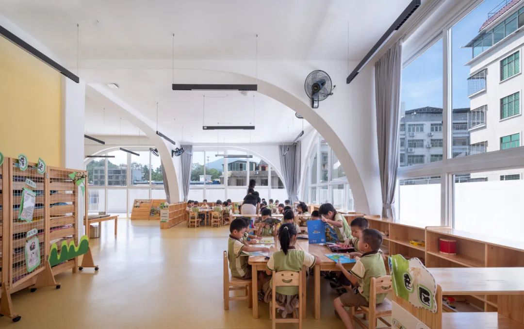梁柱一体的“拱”结构成为空间叙事的核心。取消次梁的田字形框架贯穿室内外,裸露的主梁与柱体构成可认知的建筑语法 —— 孩子们触摸的不再是被装饰包裹的界面,而是真实的结构逻辑。