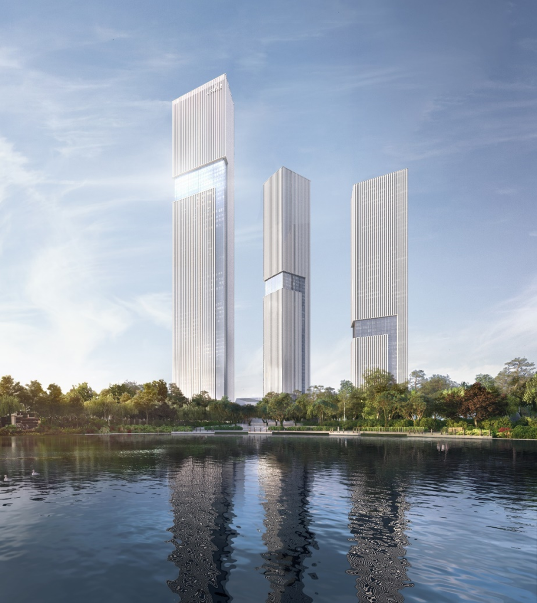 成都蔚蓝卡地亚花园城位于天府新区核心区域,由 5 栋塔楼组成,最高建筑高度达 266.6 米,总幕墙面积约 23 万平方米。该项目以“永恒的城市地标”为设计理念,通过石质立面与锯齿状陶板的组合,塑造出竖向挺拔的建筑气质。