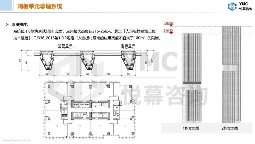 在幕墙系统设计中,最具突破性的是 B 地块 3 栋塔楼外立面的陶板单元幕墙系统。该系统应用高度达 216-266 米,突破了《人造板材幕墙工程技术规范》中 “人造板材幕墙应用高度不宜大于 100 米” 的限制。