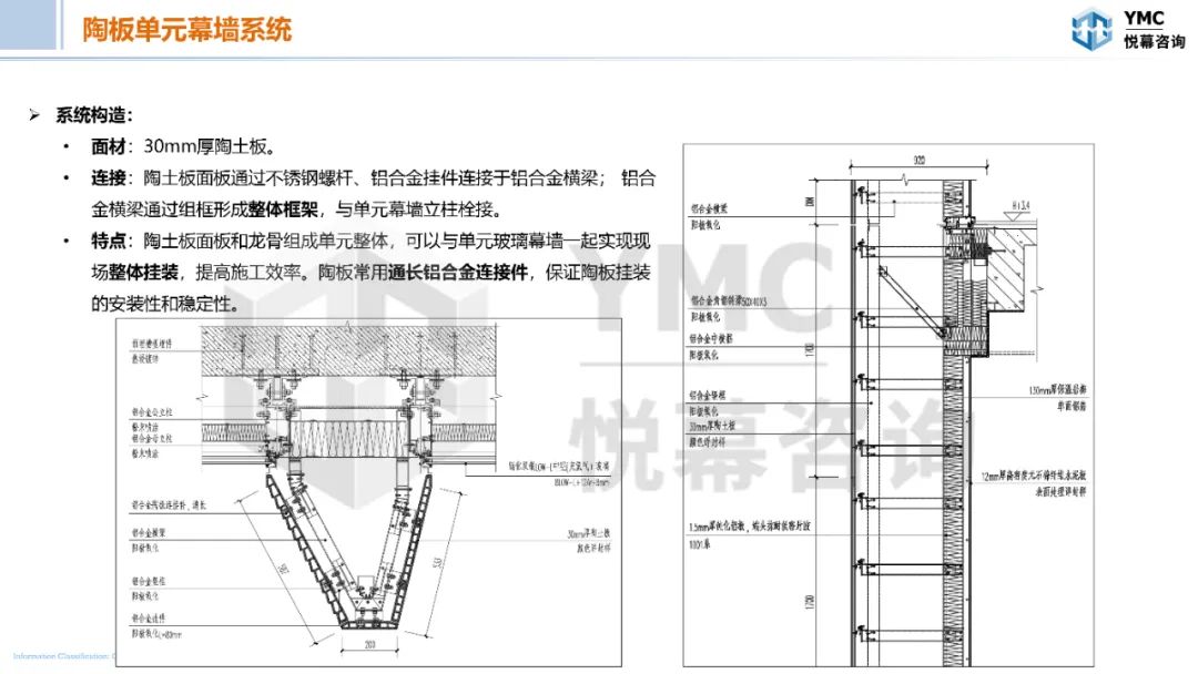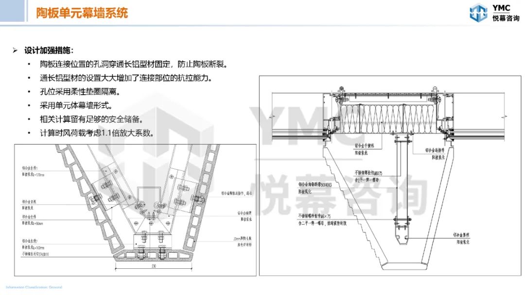 为确保安全,设计团队采取了多重加强措施:陶板连接位置采用通长铝型材固定,孔位设置柔性垫圈隔离,同时采用单元体幕墙形式,并在风荷载计算时考虑 1.1 倍放大系数,为系统提供了充足的安全储备。