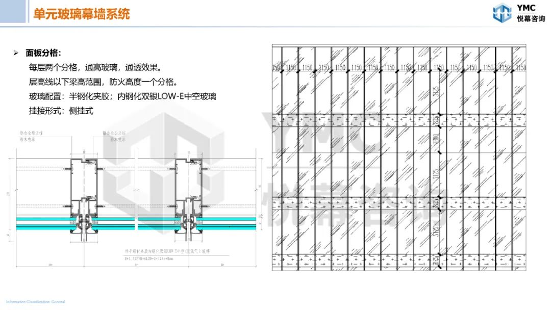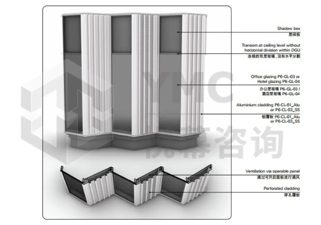 在玻璃幕墙设计上,项目采用单元玻璃幕墙系统,位于凹槽位置的面材选用外半钢化夹胶、内钢化双银 LOW-E 中空玻璃,每层两个通高分格,实现了极致的通透效果。