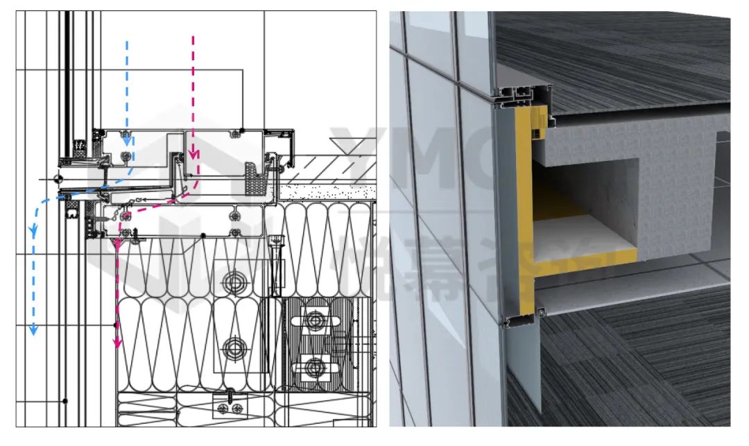 排水设计采用跨层排水方案,通过将本层上横后腔积水引流至下层单元上横前腔,利用水流动能排出结构外,有效解决了高风压区的排水难题。