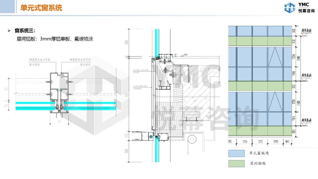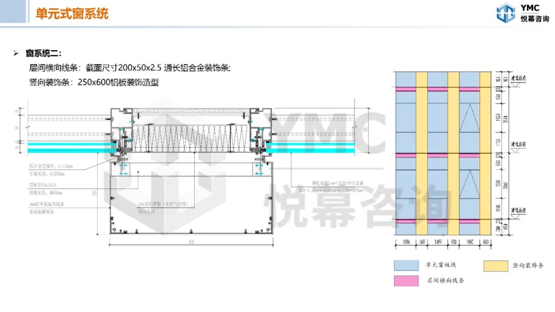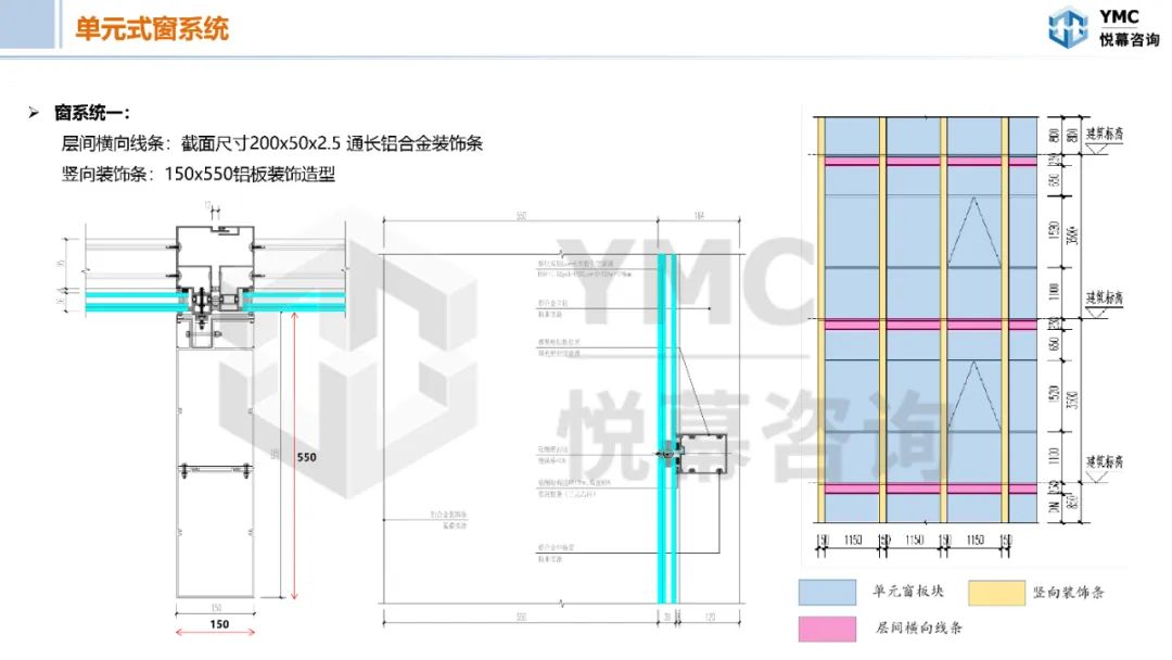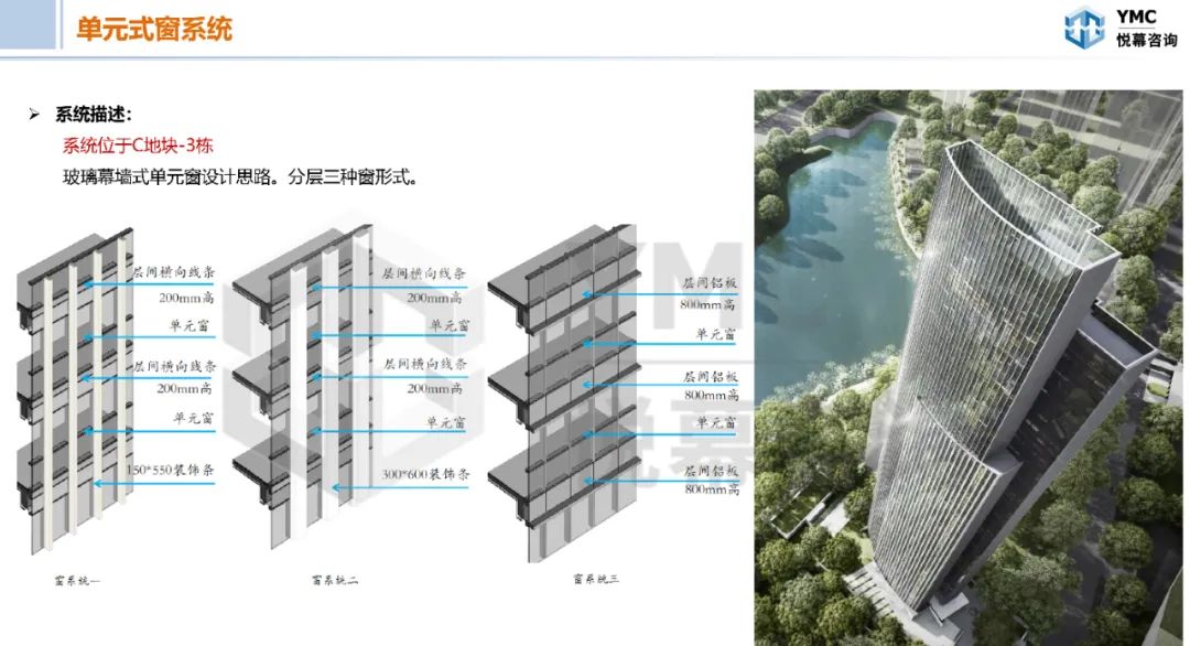 针对住宅板块,项目创新采用单元式窗系统,通过层间钢结构连接件形成安装洞口,搭配 200mm 高横向装饰线条与竖向铝板装饰条,在满足 38 号文限制的同时,通过工厂预制单元窗现场吊装,保证了住宅组团的建筑品质与加工精度。
