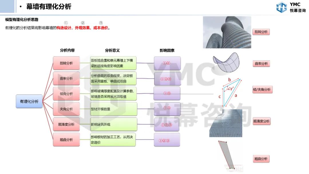 超高层建筑幕墙设计需建立完善的有理化分析体系,通过扭转、曲率、倾角、夹角、顺滑度及翘曲分析,量化建筑表皮的几何参数。