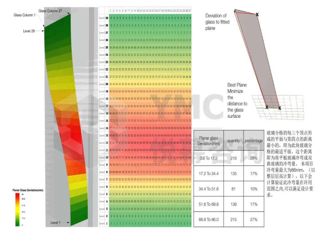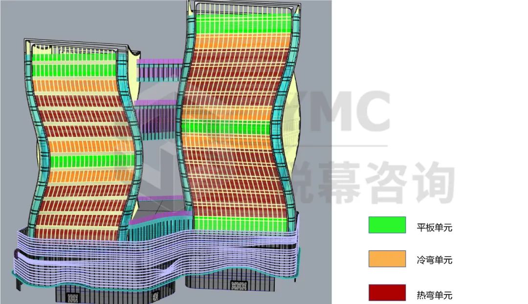在面板工艺选择上,项目基于翘曲值与冷弯应力分析,将单元类型划分为平板单元(25%)、冷弯单元(25%,翘曲值<70mm)与热弯单元(50%,翘曲值>70mm)。通过 ANSYS 有限元模拟验证,冷弯玻璃在翘曲值 70mm 以内时,冷弯应力与风荷载应力不叠加,既能保证建筑效果,又可控制成本。