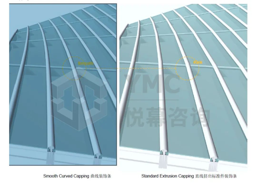 构造设计中,项目采用 “恒定几何元素” 原则:横梁上边沿前后点、钉槽相对距离及立柱与横梁腹板平行关系保持不变,通过多套横梁模具实现角度调节。同时,竖向装饰条采用单曲拟合替代直线拼接,避免了 “折线效应”,确保了曲面的顺滑过渡。