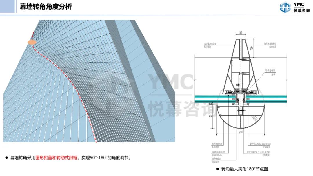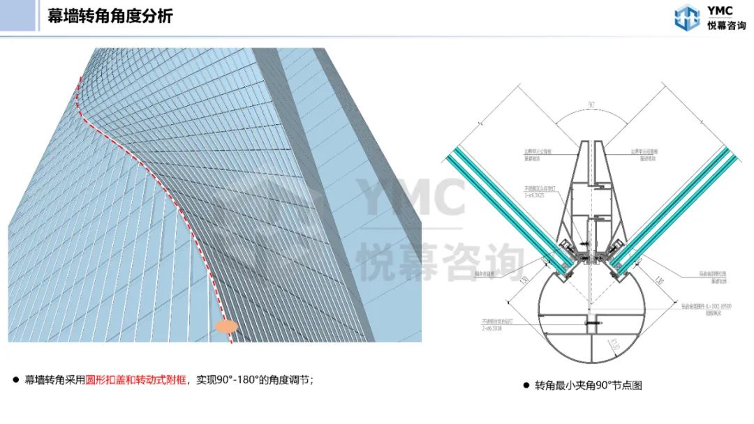 竖向构件采用圆形断面装饰条,避免因轴心扭转导致的加工困难,同时在转角位置采用转动式附框与圆形扣盖,实现 90°-180° 角度调节,解决了曲面过渡难题。