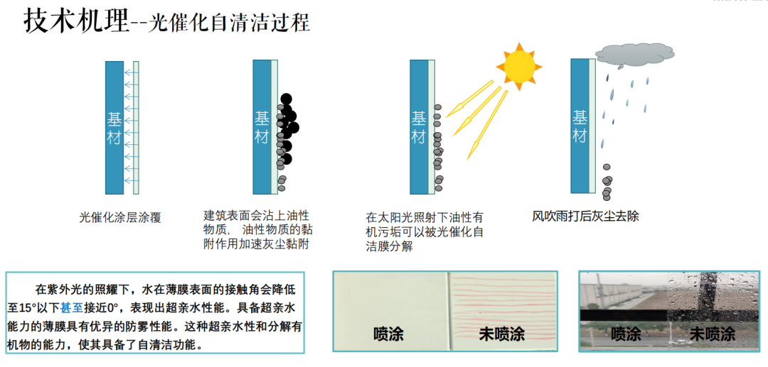 · 光催化自洁涂层:应用于金属屋面与幕墙表面,具备分解有机物、防污、防雾等功能,延长清洗周期;