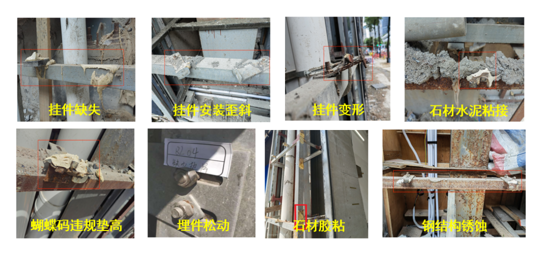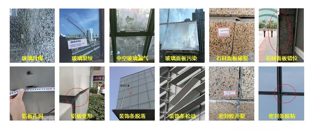 幕墙表观缺陷多样,涉及面板、室外构件、密封材料等 40 余种,如玻璃幕墙的玻璃自爆、裂纹,石材面板的开裂、破损,铝板的孔洞,装饰条的脱落、松动,密封胶的开裂、脱粘等。传统人工检测效率低、易漏检,且需高空作业,安全风险大。