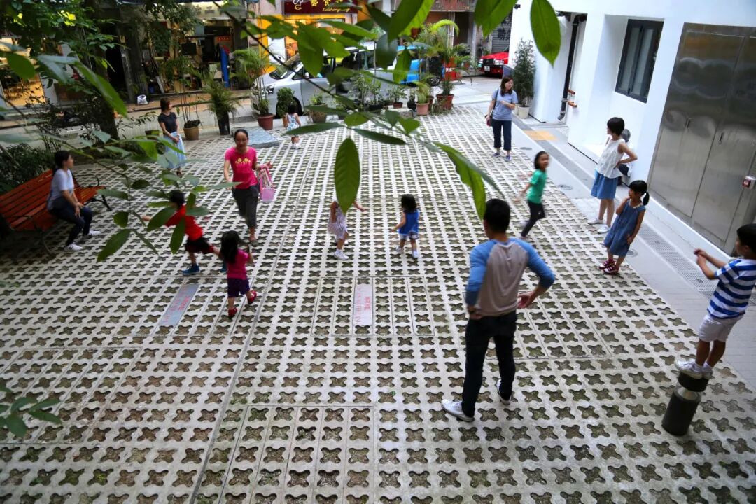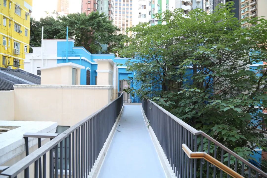 “干预” 则是为了填补社区的 “功能空白”。设计团队没有凭空创造,而是顺着居民的需求生长:拆除无用的板间房,为每户增设小型厨房与浴室,让曾经“抢厕所”的日子成为过去;将围了几十年的铁丝网空地改造成公共花园,架起连接蓝、黄、橙三座唐楼的连桥与电梯 —— 这条连桥不仅解决了 “上下楼难”,更成了居民口中的 “活动性教学场”:站在桥上能看见老烟囱与瓦面顶,有人第一次触碰到树顶的叶子,有人隔着楼层与邻居打招呼。