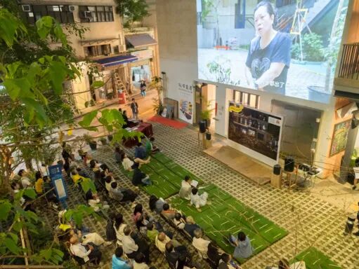 周末的蓝屋空地,老街坊攥着分类好的厨余垃圾,和邻居絮叨这周的生活;孩子们趴在连桥栏杆上,指着屋顶的旧烟囱追问过往;白色墙面上正投射着老港片的画面,中秋刚过的月光似乎还粘在砖缝里 —— 这不是博物馆精心复刻的 “怀旧场景”,而是蓝屋居民每天都在发生的日常。