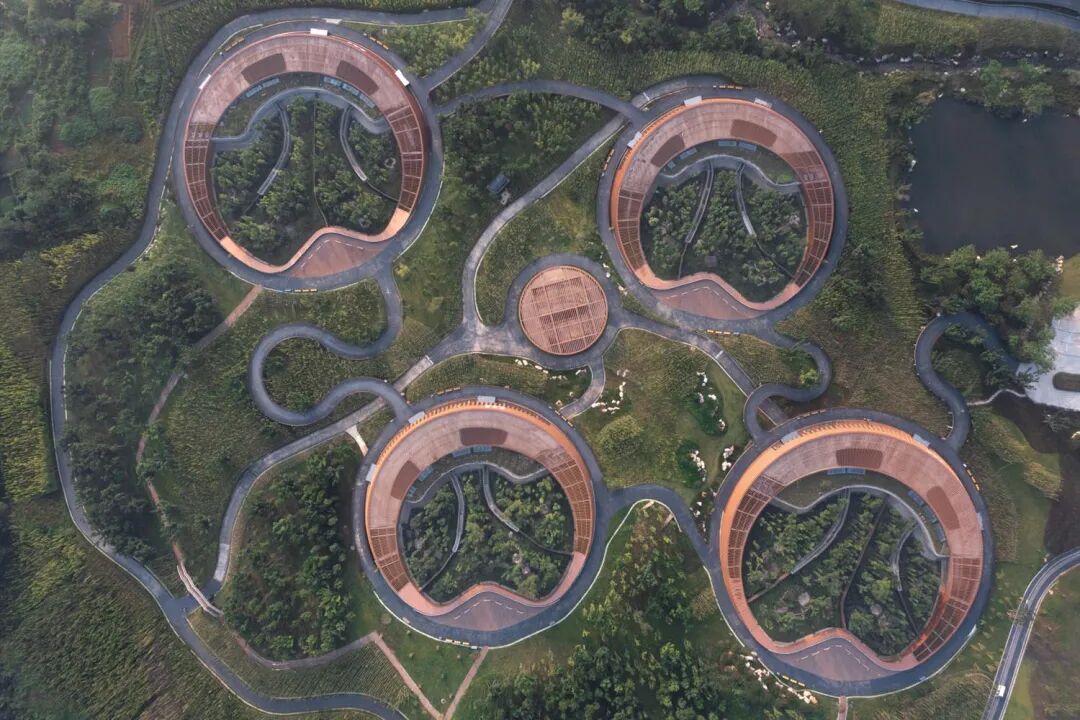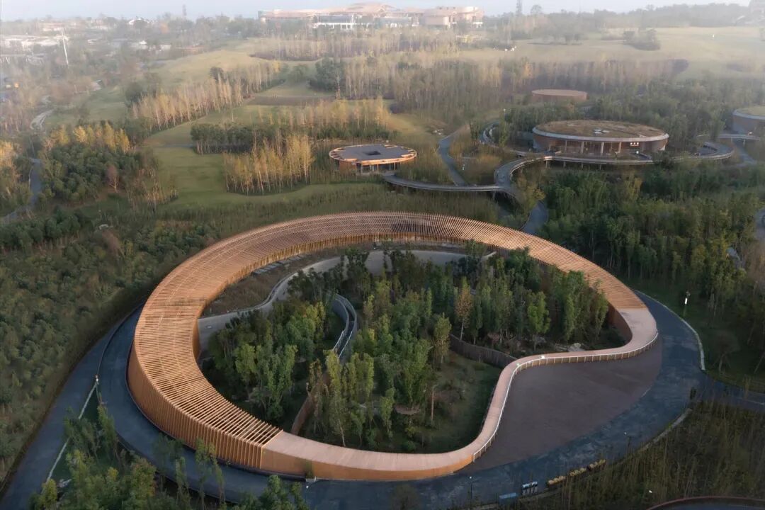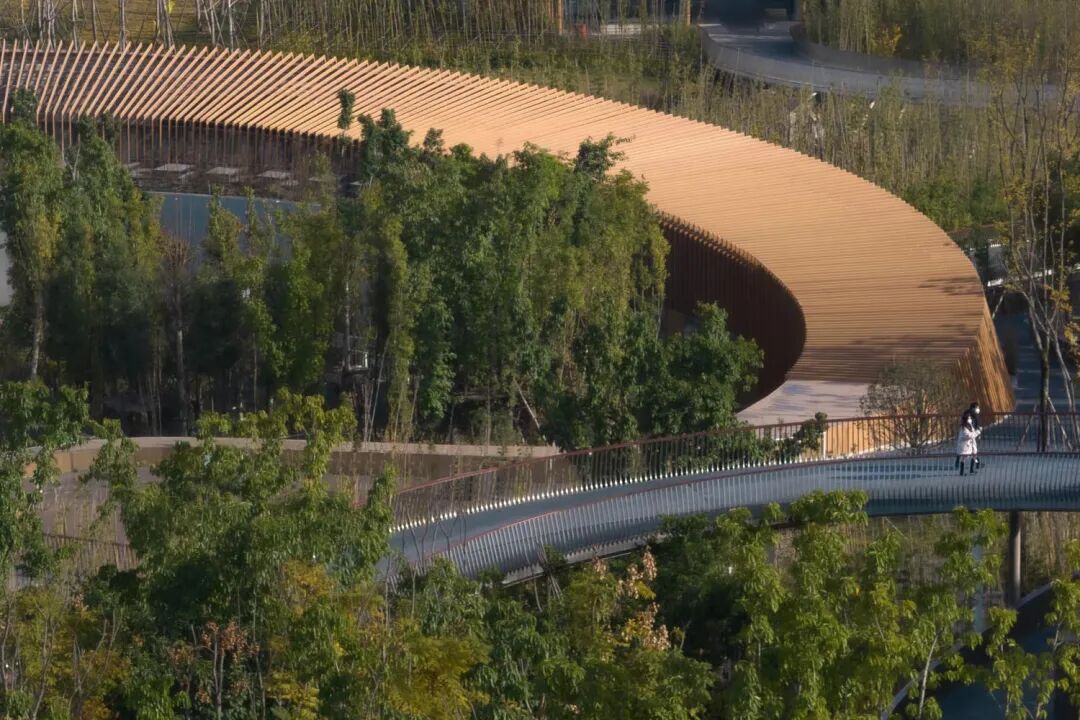 熊猫新舍位于成都市区北郊的茂林修竹中,为促进生物多样性的有效保护,建筑师从环境及动物友善的角度切入,选择创新适宜、回应环境的低冲击设计策略。设计顺应地势,将四个融合了动物行为研究、科普教育、旅游观赏等新型功能的熊猫新舍环抱于自然中,让嵌入山地溪谷之间的建筑与景观环境融为一体。