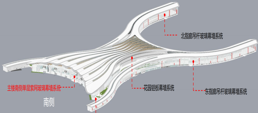 南立面:全国首例 “拉索 - 网架” 一体化单索幕墙