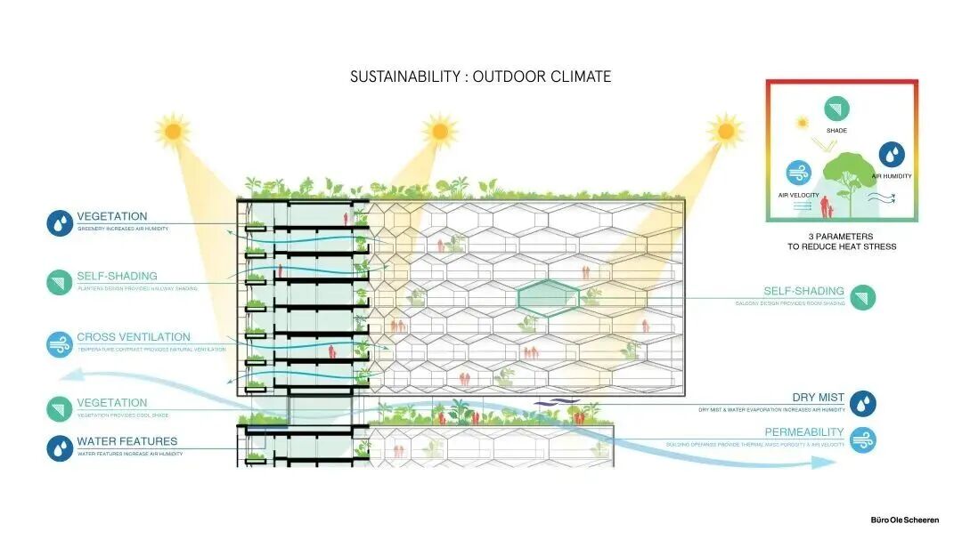 建筑体量由五个功能各异的模块“堆砌层叠”而成。这种向上发展的策略,最大限度地减少了建筑对地面的占用,将宝贵的土地还给绿植与景观。同时,错落布局的建筑体块与精心设计的空中开口,使得绿色得以垂直蔓延,形成了从地面至高空、层次丰富的“立体绿洲”系统。