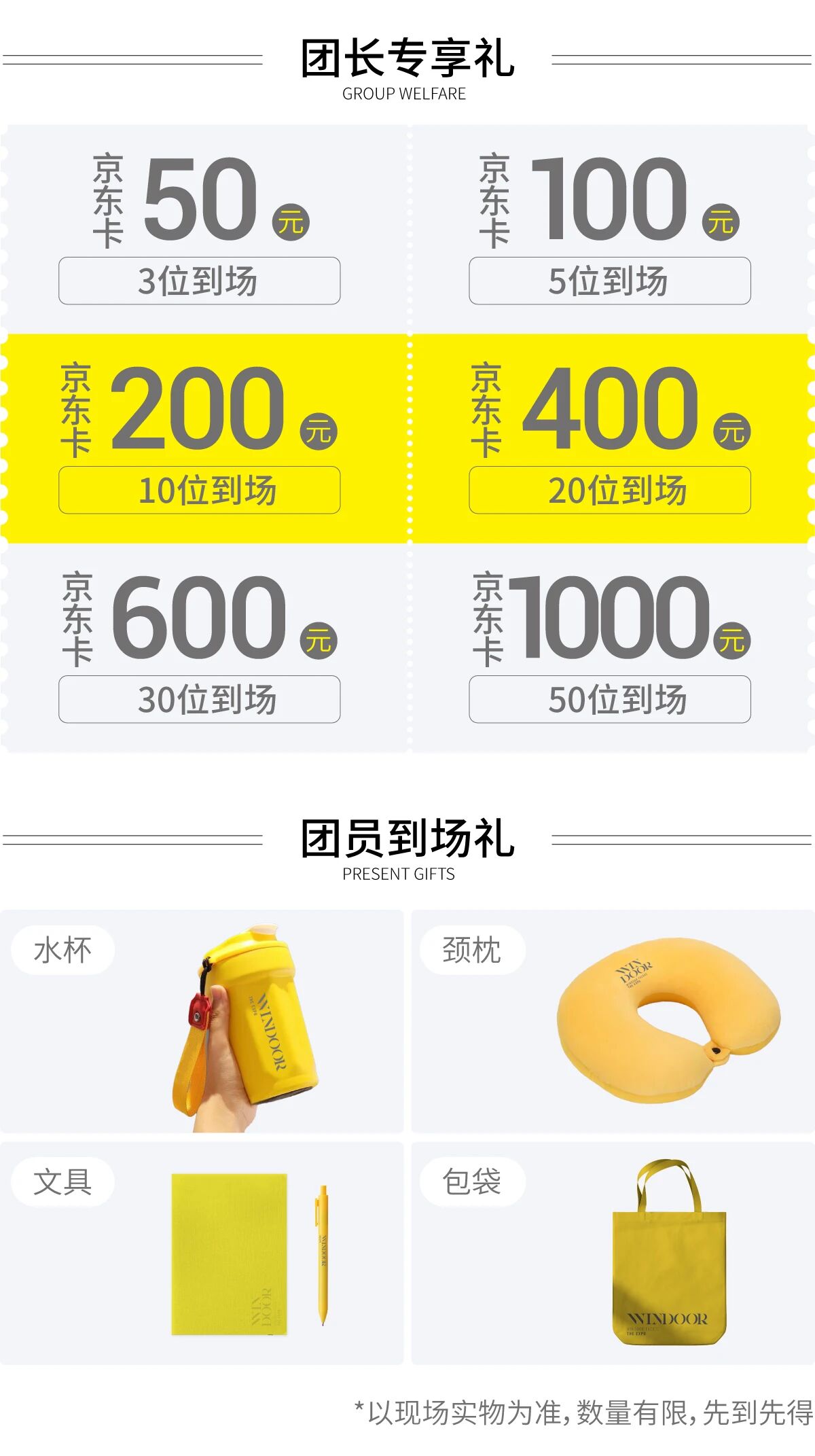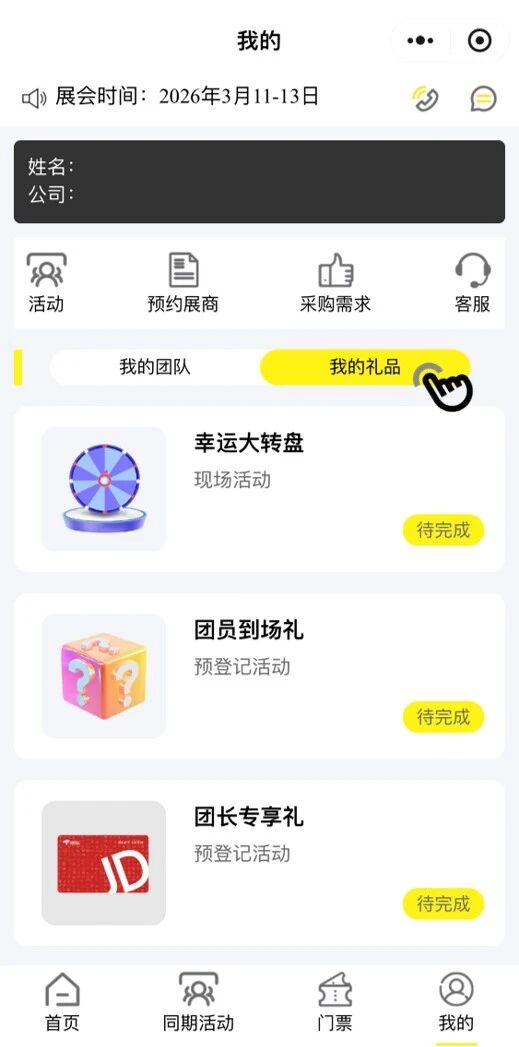 成为团长,邀请好友参观展会,团队到场人数越多,团长可领取京东卡金额越大,最高可达1000元现金卡奖励,通过团长邀请到场的所有好友,均可获得逛展礼品1份。