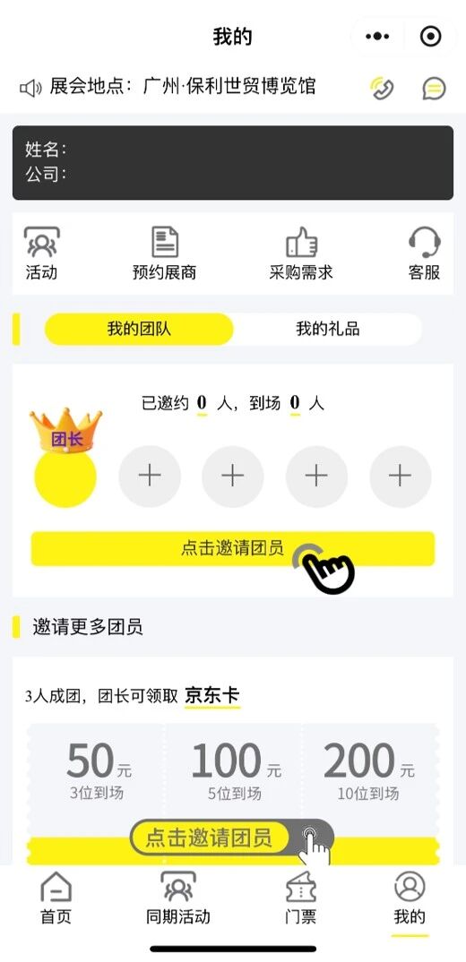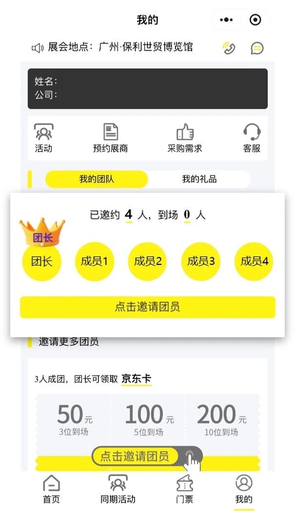 登记完成后,点击右下角【我的】进入页面,并按下【点击邀请团员】,即可参与活动。