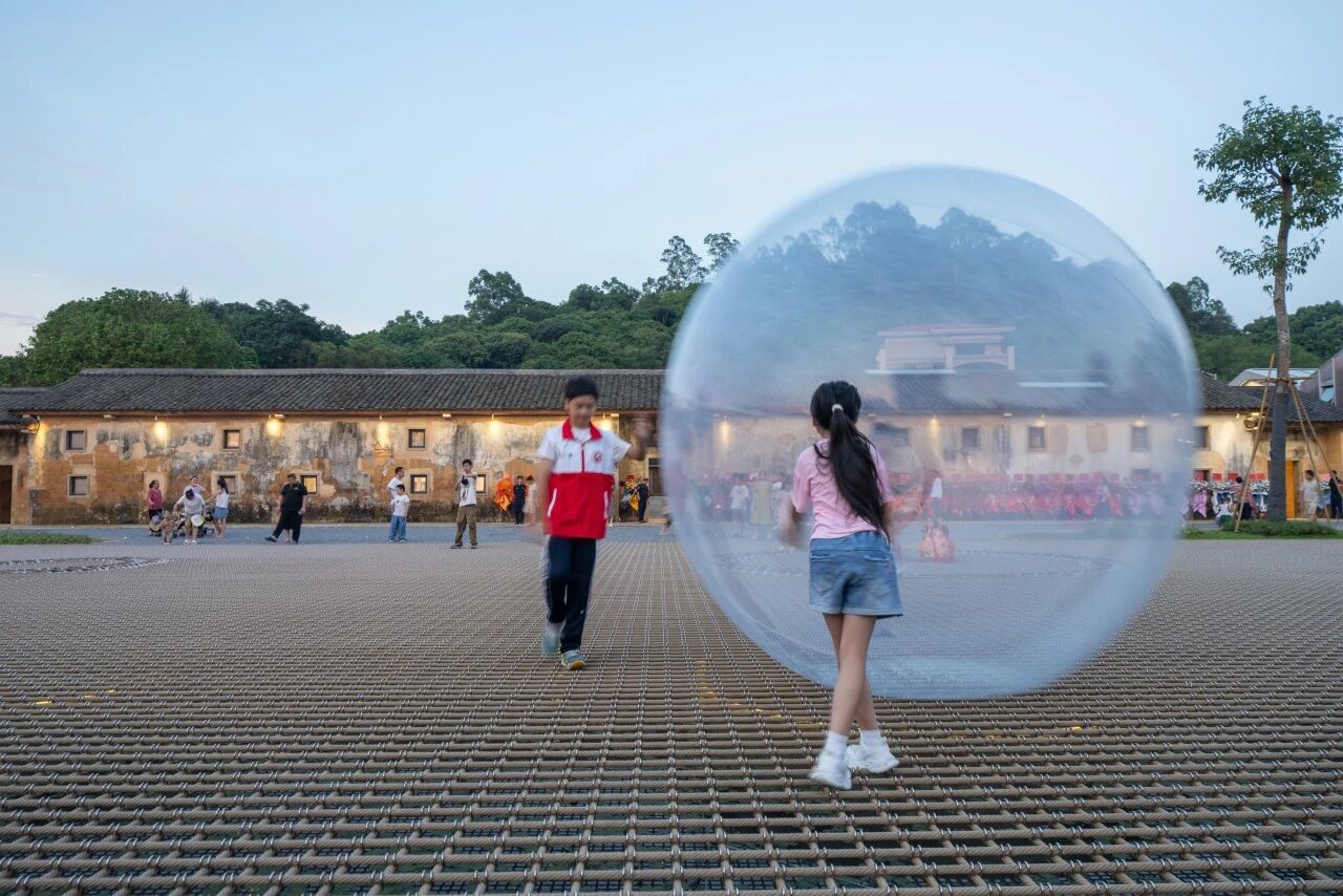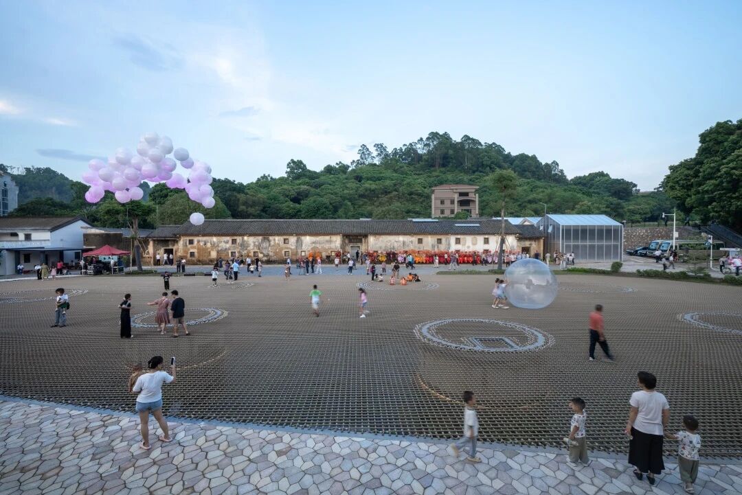 “乡村不应被城市的‘文明成果’生硬植入。” 基于这一认知,朱小地提出了 “织一张网” 的创意:保留水塘的蓄水、排水功能,在上方搭建弹性绳网,打造出一个无边界、可互动的公共空间。这一设计不仅移除了突兀的不锈钢栏杆,更创造了兼具游戏性与社交属性的 “软广场”—— 人们站在弹性绳网上,行动彼此影响,外来游客与本地村民的互动边界自然消融。