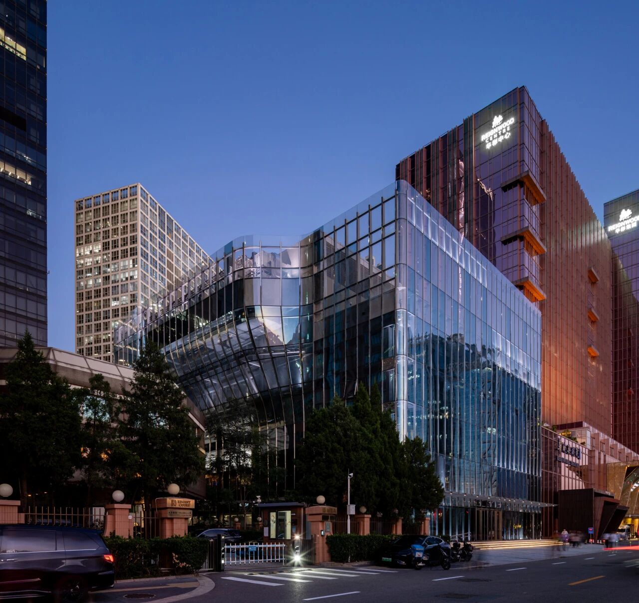 幕墙是项目的视觉核心:底部采用浅灰蓝色,向上逐渐过渡为虚化效果,以 “无止境” 的视觉意象传递向上生长的力量,既规避了中国幕墙体系在精致度上的短板,又让小楼在高楼间拥有了独特存在感。