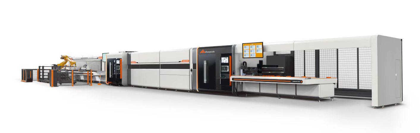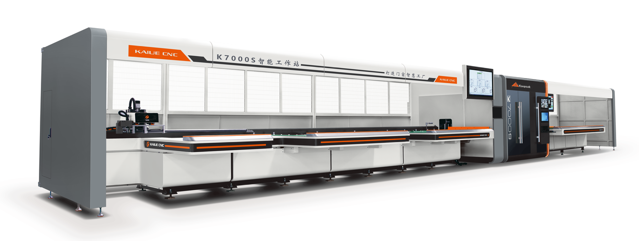 为满足高产能需求,本机基于 K7000 铝材智能激光锯铣工作站拓展架构,释放 K7000Super 部分功能提升产线效率。设备分两段:前段为 K7000 四面钻铣 + 双激光打孔 / 划线 + 90° 锯切增效线,后段为 K7000Super 全功能工作站。
