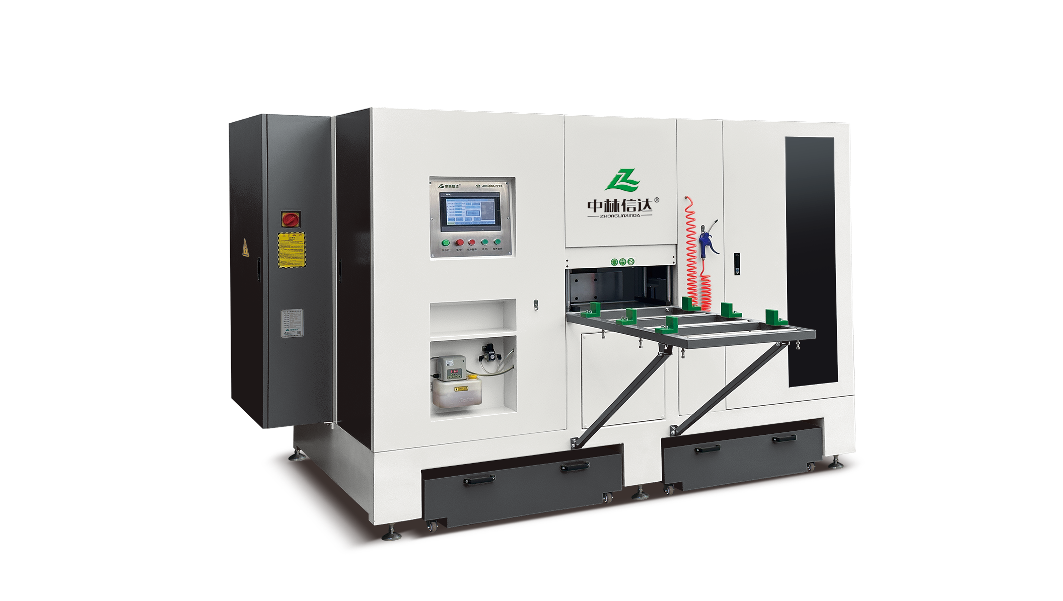 端铣结构:X 轴采用的精密齿条进给 ,Y 轴和 Z 轴采用精密的滚珠丝杆传动 ,无需人工调整刀锯位置。配备双主轴双头铣削电机,即 A 组铣削和 B 组铣削。每个主轴电机采用双出轴结构。每组主轴安装 2 片铣刀 ,共可安装四片铣刀。A 组铣削可以切换水平方向和垂直方向 ,主轴电机可自动实现立卧转换 ,实现型材端面水平、竖直槽口的铣削功能。 B组铣削带快速定位板功能。进给系统采用总线绝对值伺服电机传动 ,速度位置可调 ,切削进给平稳均匀。采用金刚石铣刀,加工精度高 ,表面质量好。配备自动给油润滑系统 ,有效的保护导轨和丝杆 ,延长其使用寿命。