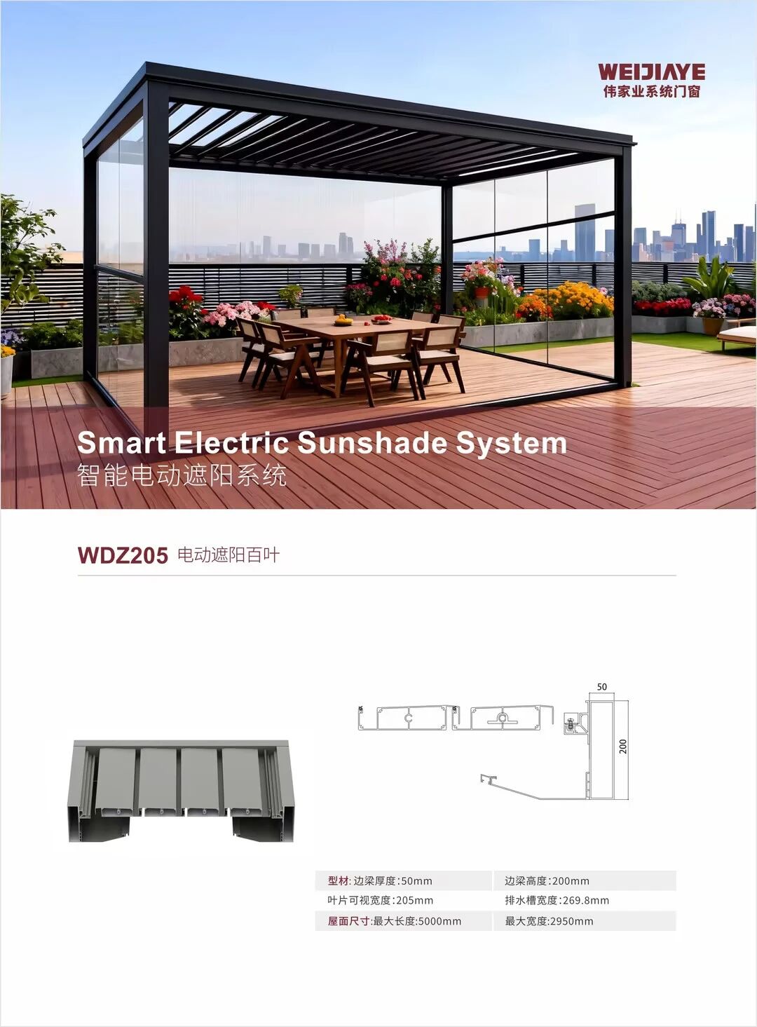 主体框架采用3.0mm的铝合金,安全防腐。配合双层大叶片。能适应大部分地区使用.每个百叶凉亭的百叶叶片内部都内置了橡胶密封条,既能遮挡雨水,又能消除风噪。特殊的立柱设计,可实现水路与电路分离排布。支持遥控,远程,语音多种操作方式.独特的隐藏电机设计,既美观,又能减少灰尘堆积。