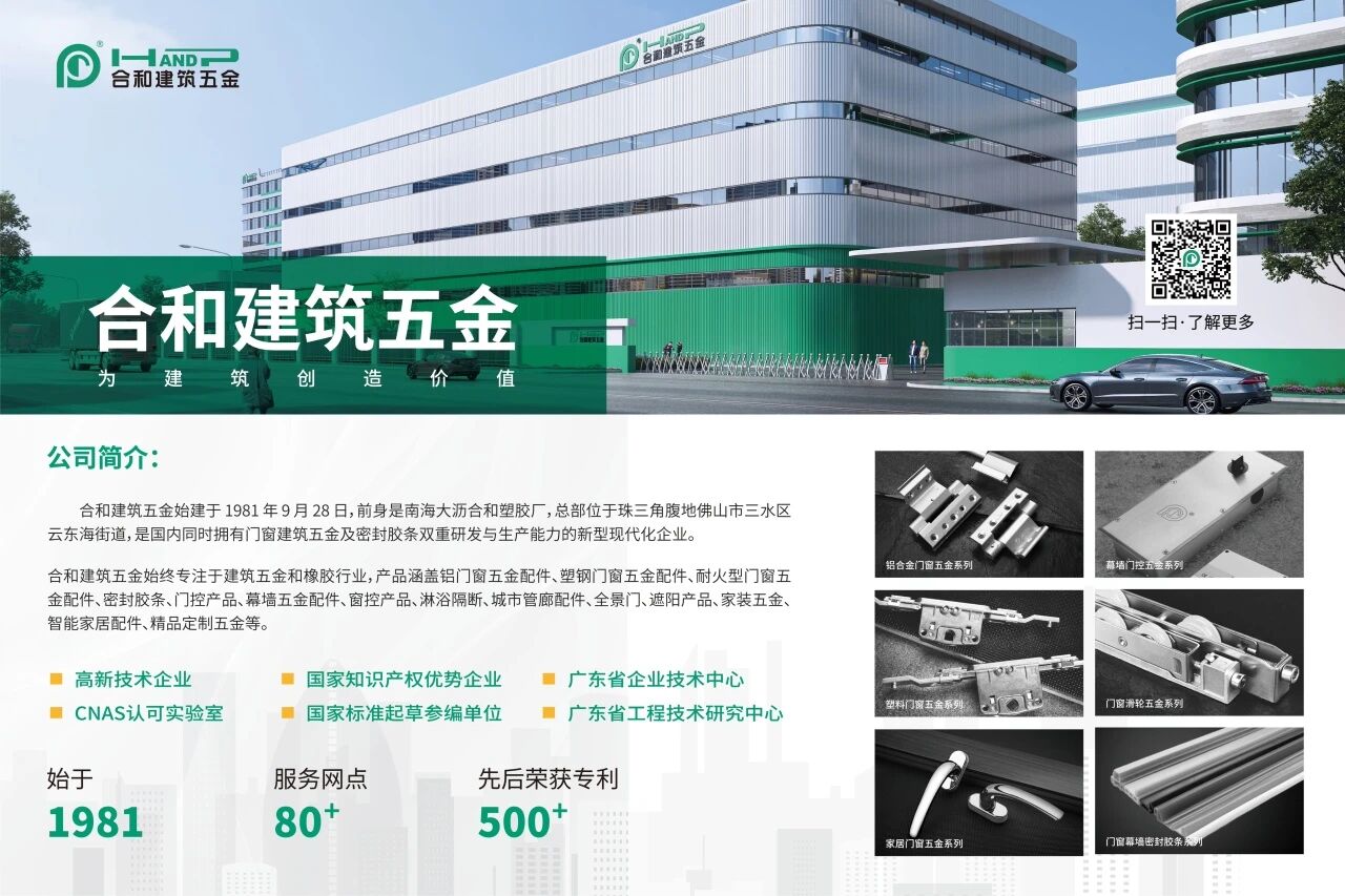 · 主营产品:合和建筑五金始终专注于建筑五金和橡胶行业,产品涵盖铝门窗五金配件、 塑钢门窗五金配件、耐火型门窗五金配件、密封胶条、门控产品、幕墙五金配件、 窗控产品、淋浴隔断、城市管廊配件、全景门、遮阳产品、家装五金、智能家居 配件、精品定制五金等