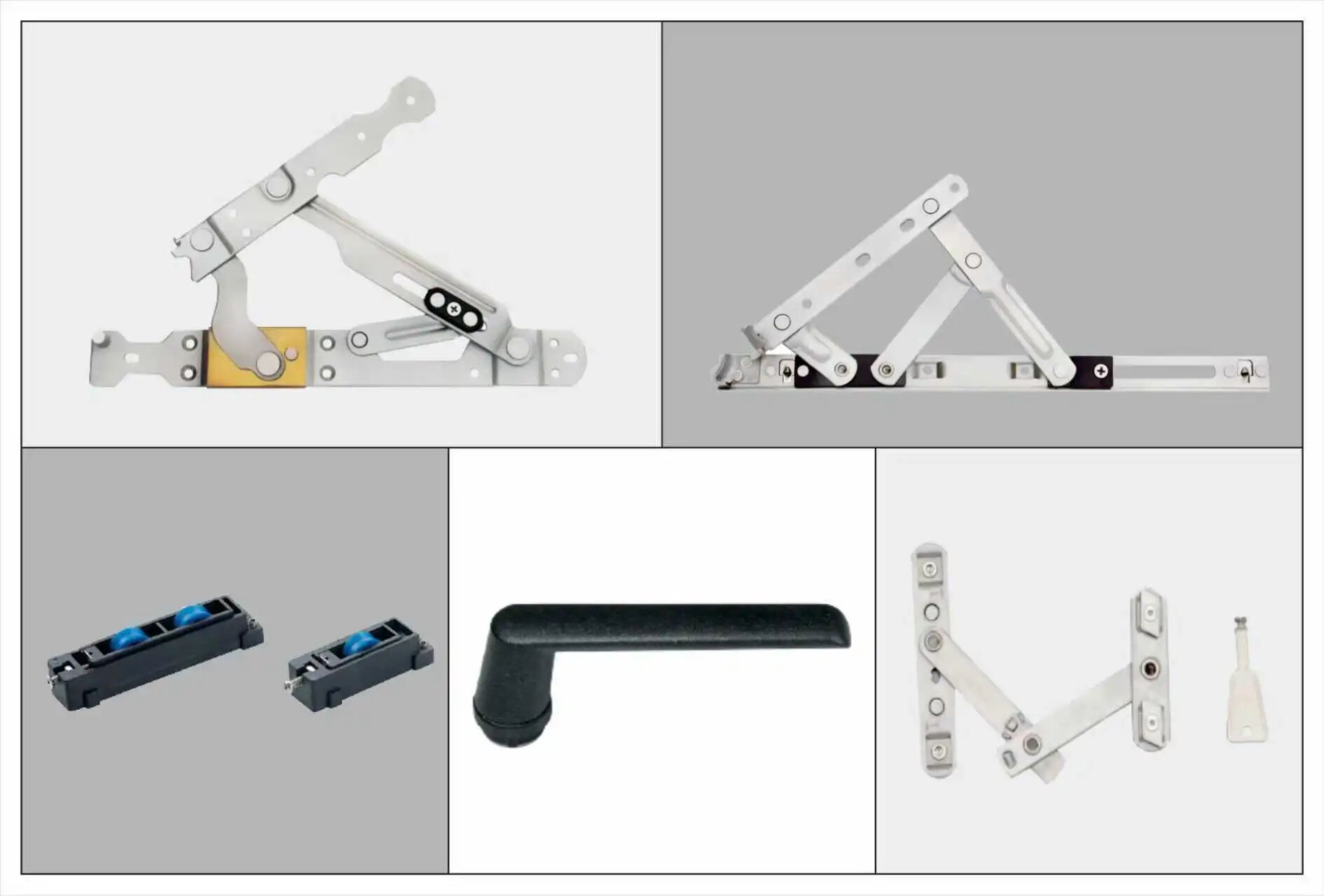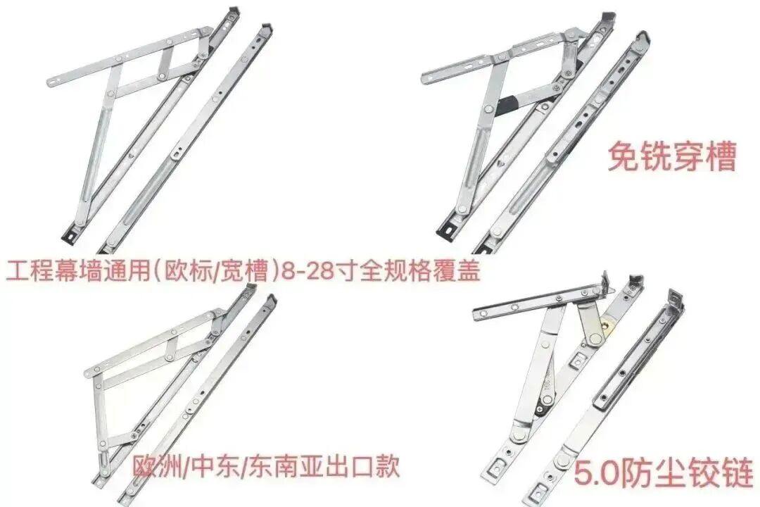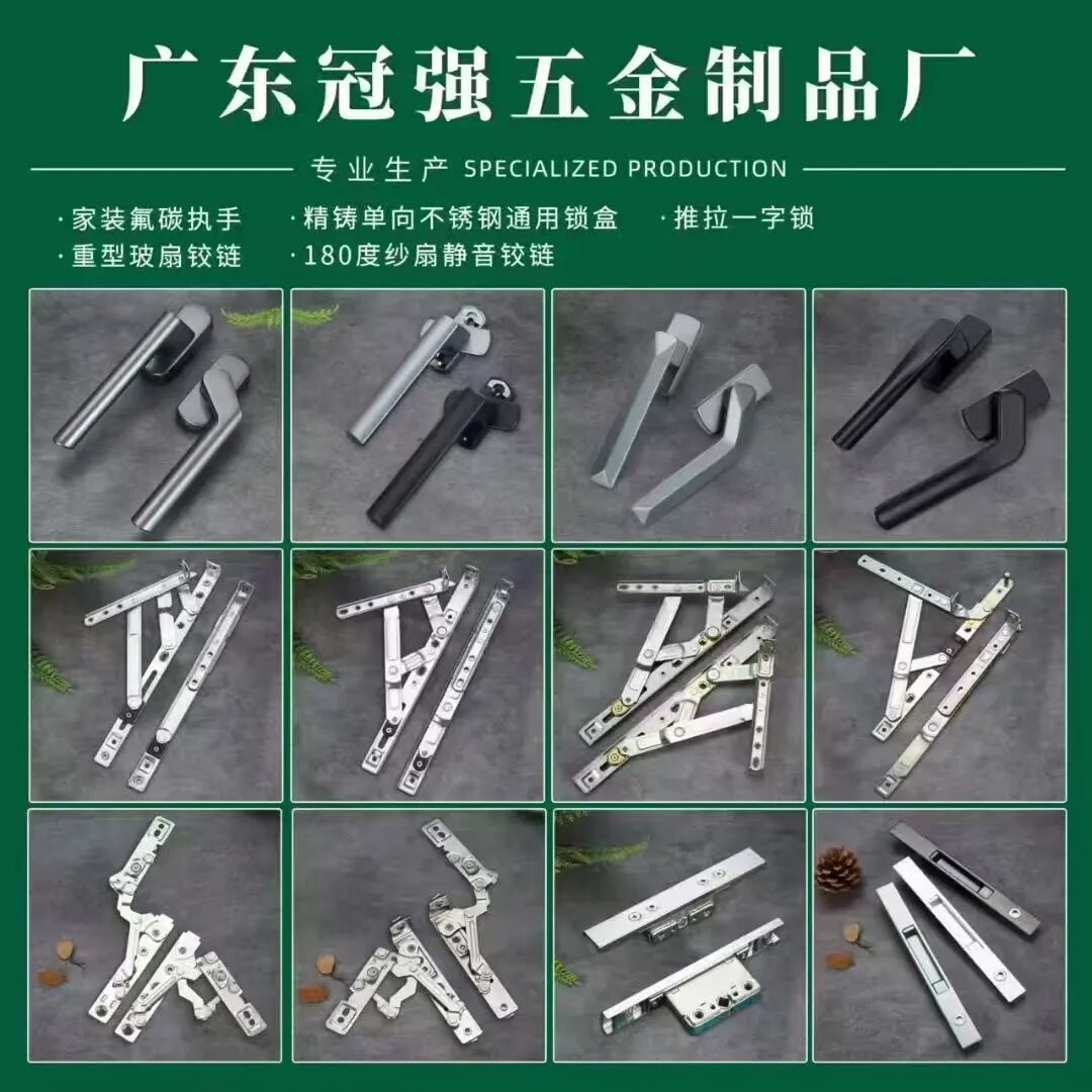 · 主营产品:不锈钢滑撑铰链、传动器、执手、滑轮等门窗五金配套件