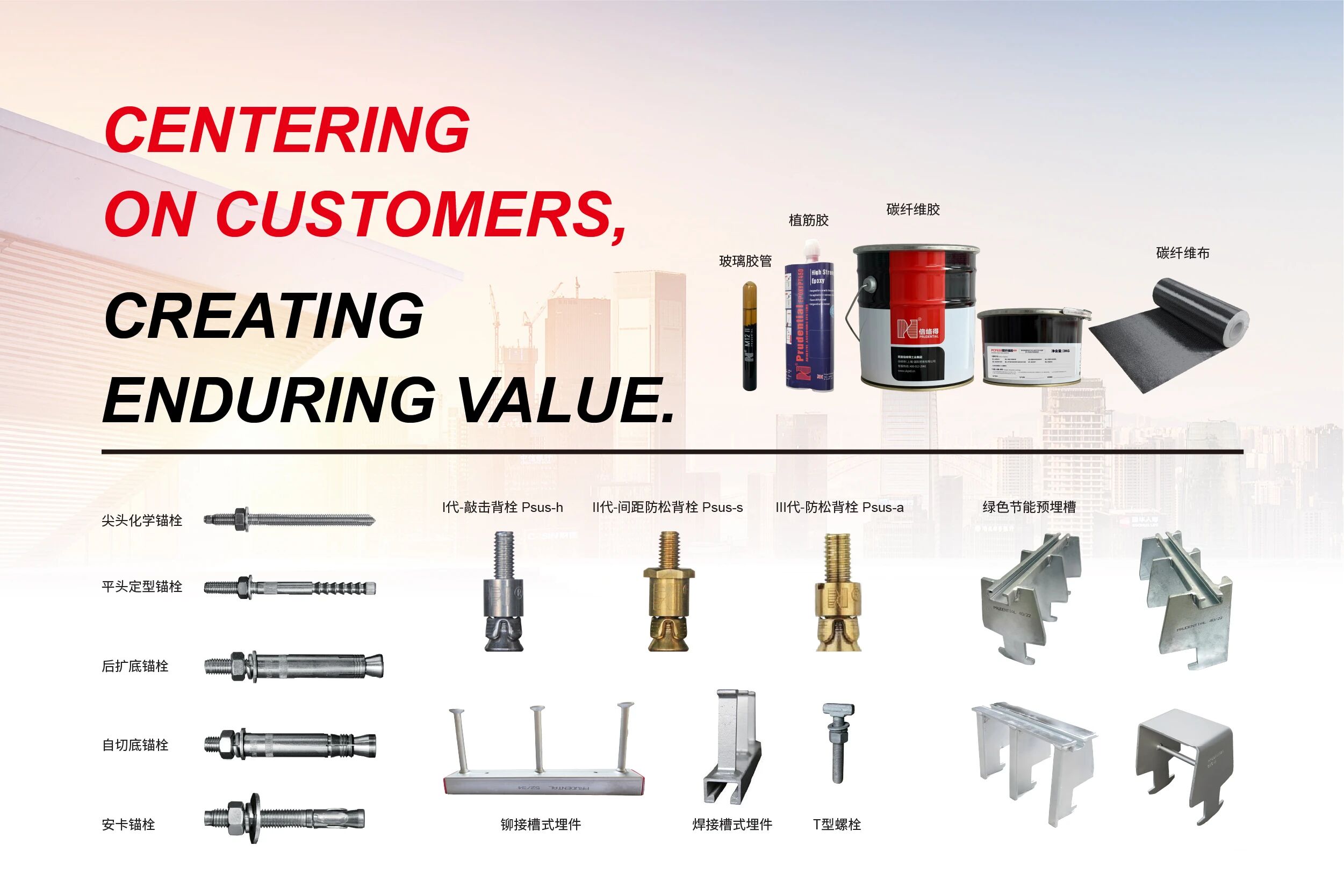 · 主营产品:背栓、化学锚栓、定型锚栓、注射式植筋胶、后扩底锚栓、自扩底锚栓、预埋槽道、T型螺栓