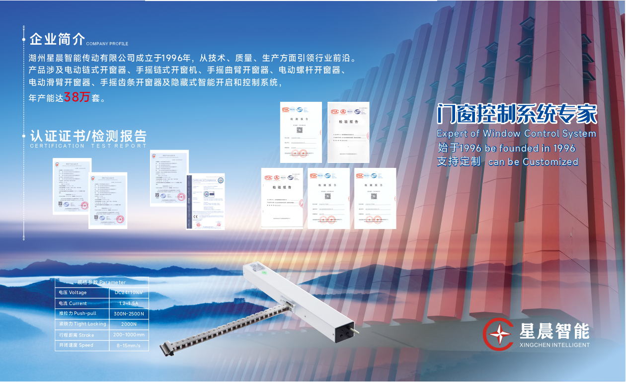 · 主营产品:智能内开型电动提升窗、隐藏一体式电动窗、拉扣链式电动开窗器、重型推杆式电动开窗器、专业的消防排烟与智能通风系统解决方案等