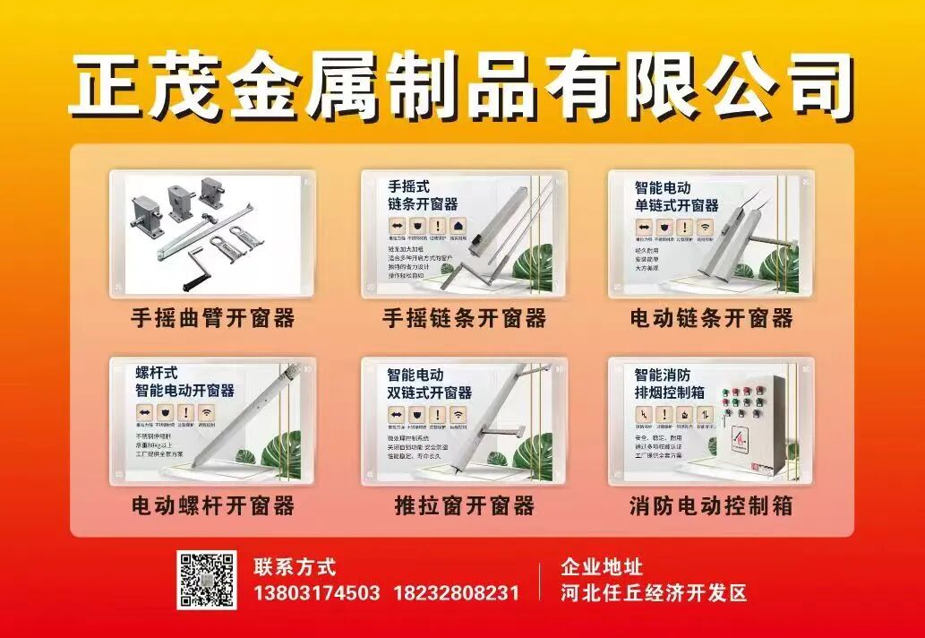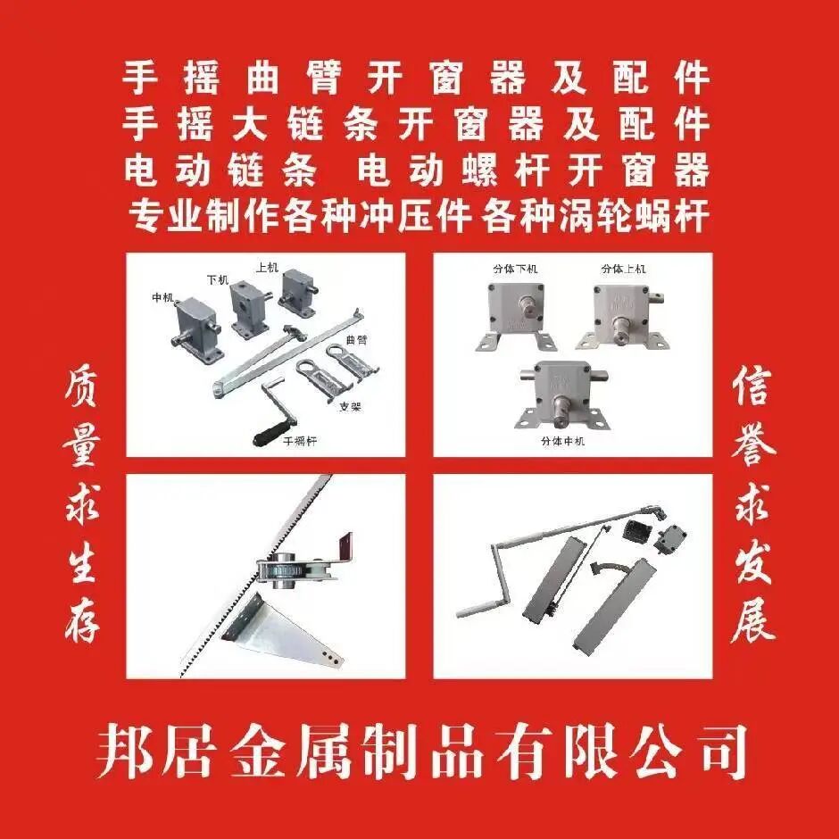 · 主营产品:各类电动链条式开窗器、电动螺杆式开窗器,电动螺杆百叶驱动器,电动滑臂式推拉窗开窗器,90度平开窗转臂开窗器,手动链条式开窗器,手动曲臂联动开窗器等。