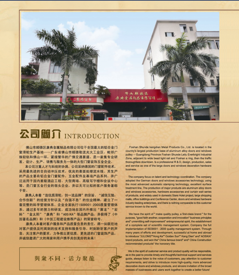 · 主营产品:浴室玻璃门五金配件、折叠门五金配件、铝门窗五金配件、衣柜门五金配件、玻璃门五金配件、车库门和谷仓门五金配件、紧固五金配件、金属门窗拉手